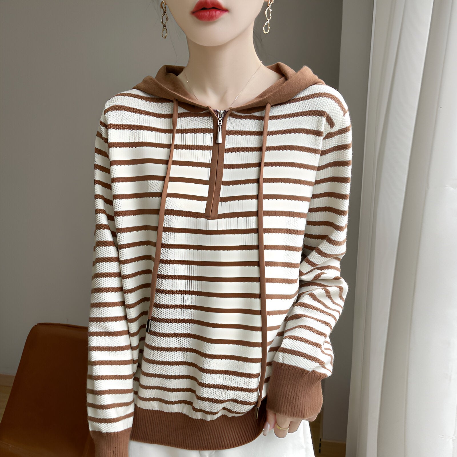 Svep in dig i värme och stil med denna vackert utformade randiga stickade jumper. Perfekt för kallare dagar, den lösa passformen och de långa ärmarna garanterar ultimat komfort. Det tjocka ulltyget ser till att du håller dig varm samtidigt som du ser moderiktig ut. Tänk dig att promenera på kalla vintermorgnar eller njuta av en mysig fika med vänner - allt medan du är insvept i den här lyxiga plagget.