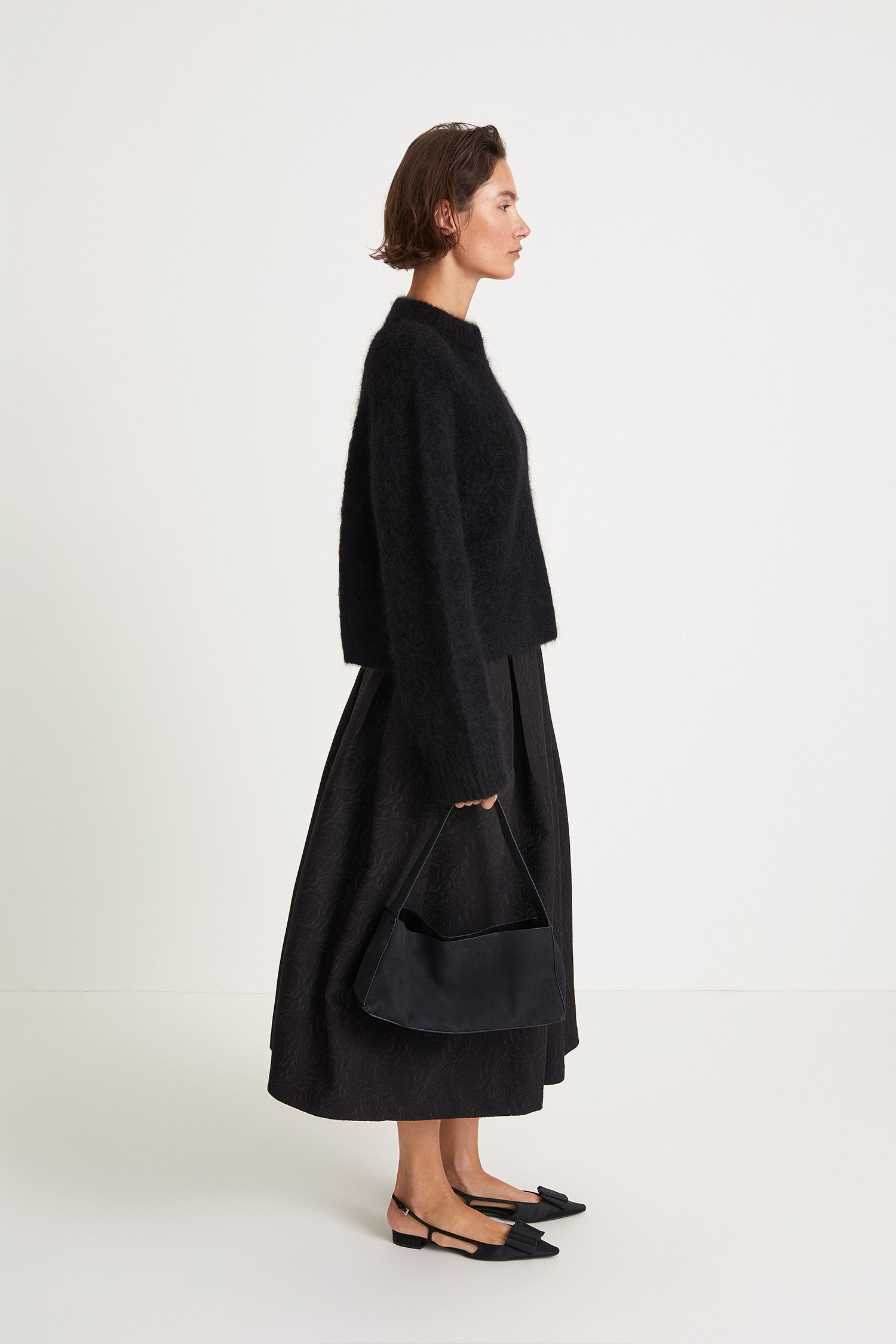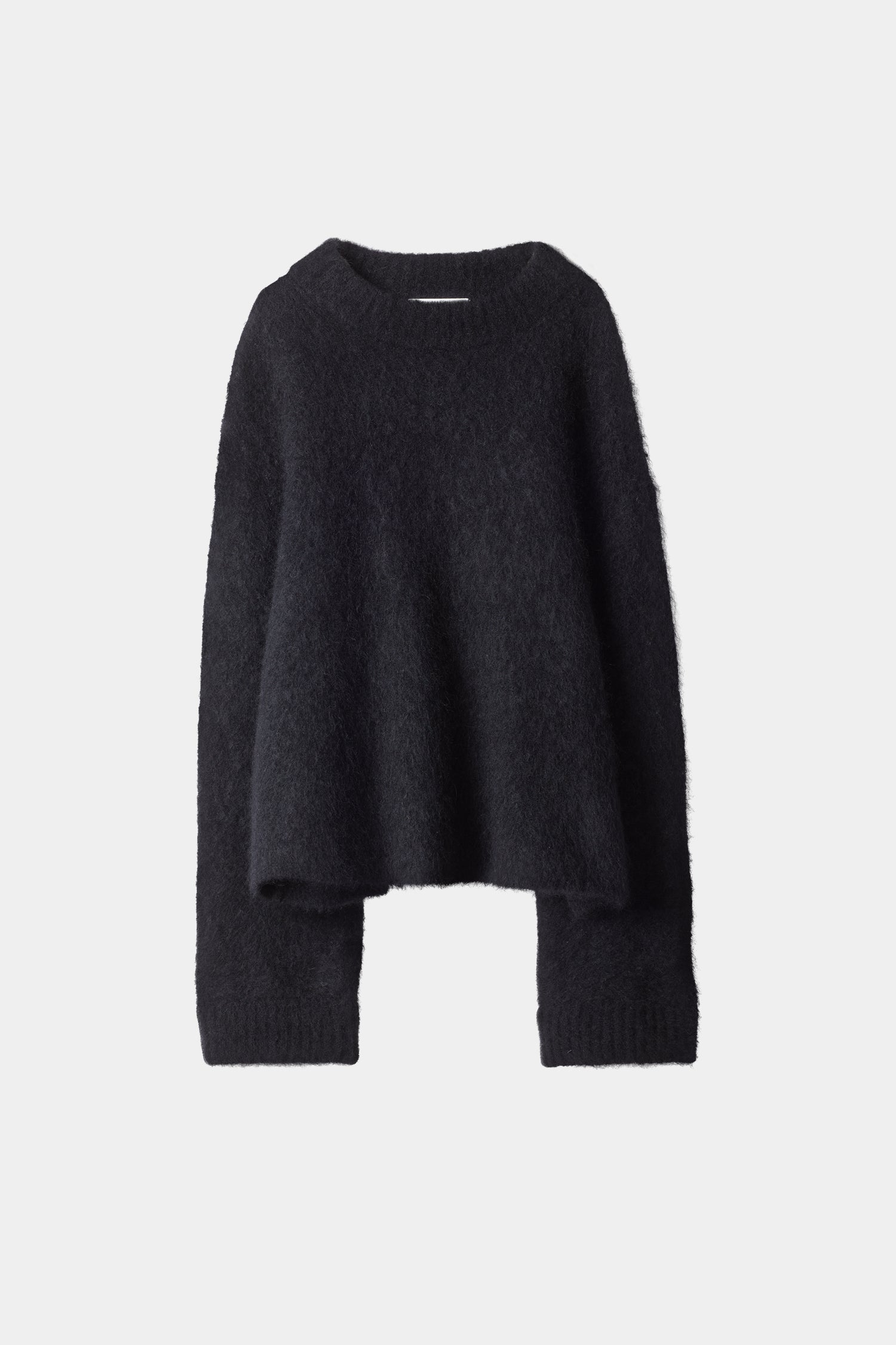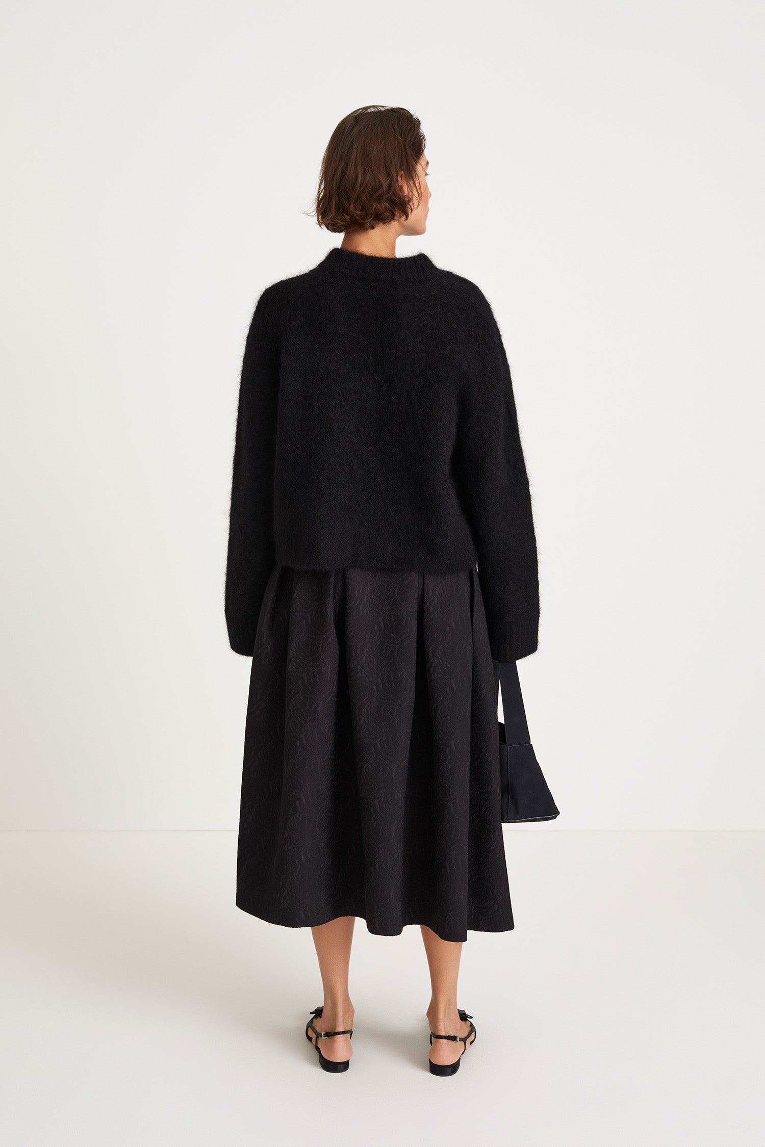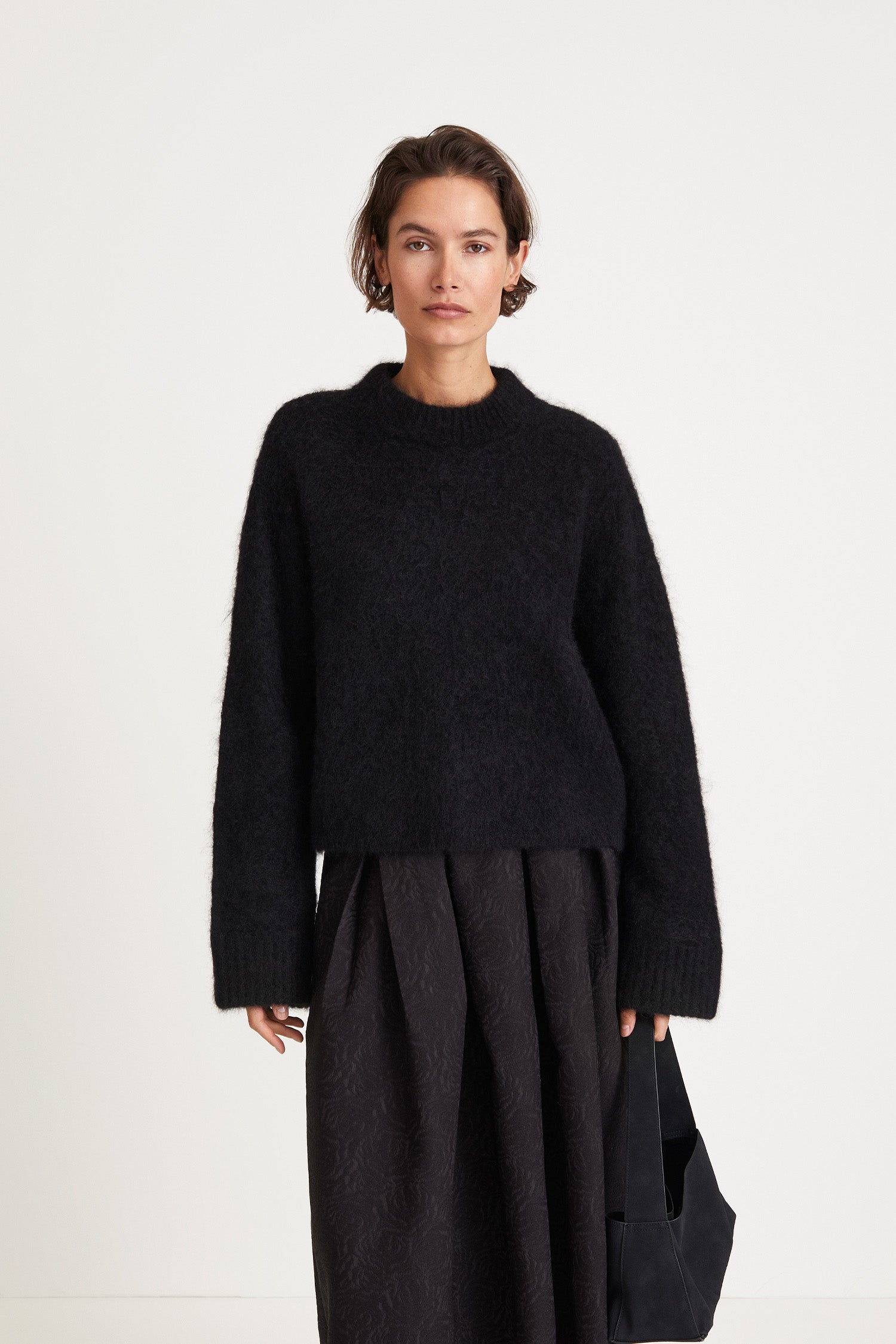 Svep in dig i Åsa-tröjan, en mångsidig stickad tröja designad för en stilfull och avslappnad look. Tillverkad av en lyxig mohairblandning har denna oversized tröja en kort, boxig silhuett med en hög-låg fåll, vilket skapar en modern men tidlös stil. Mjuk och fluffig textur säkerställer maximal värme och komfort, medan de förlängda ärmarna ger en sofistikerad touch.