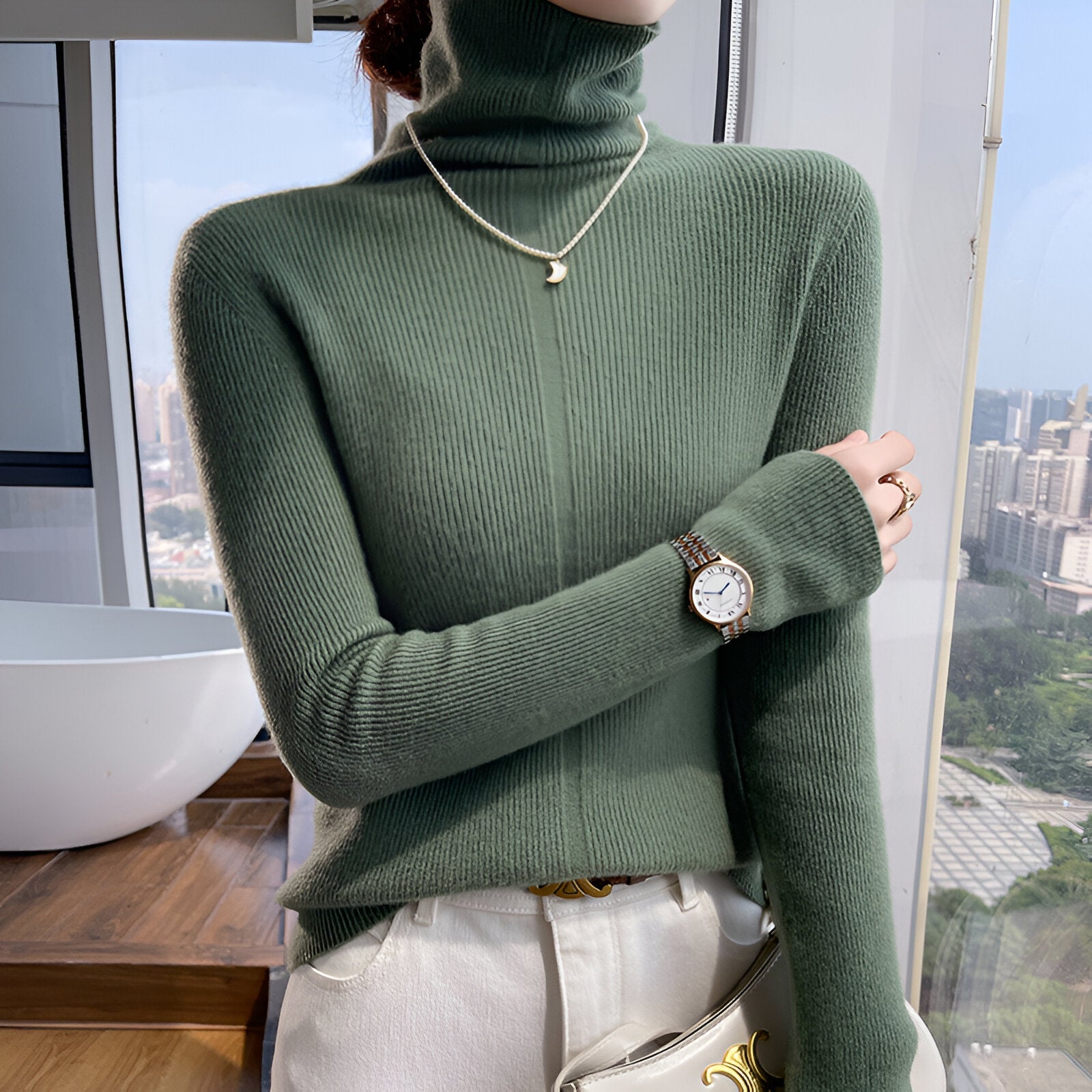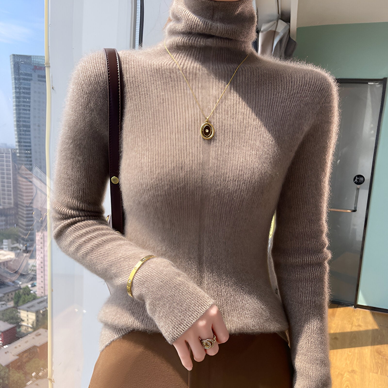 Föreställ dig att du sveper in dig i denna utsökta jumper med hög krage tillverkad i 100% ren ull. Den är perfekt för de kyliga höst- och vinterdagarna och ger inte bara komfort utan också en elegant touch till din garderob.