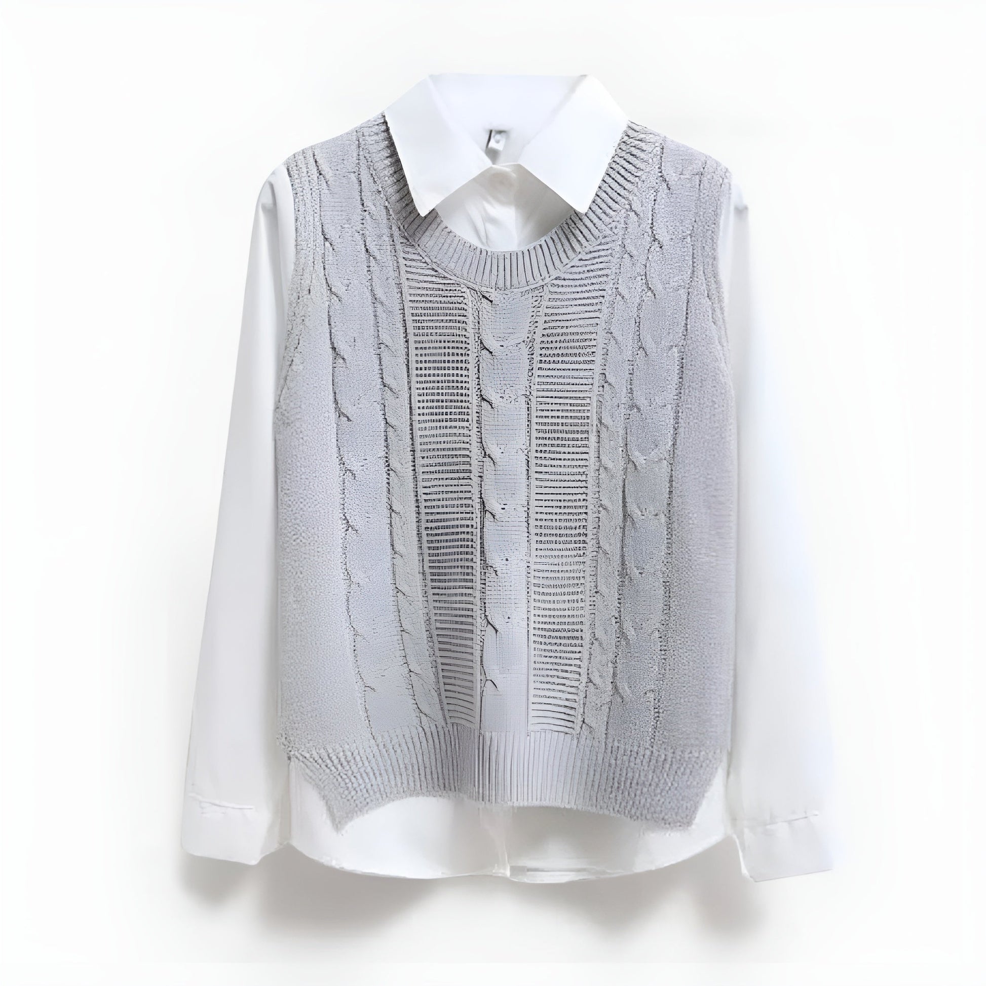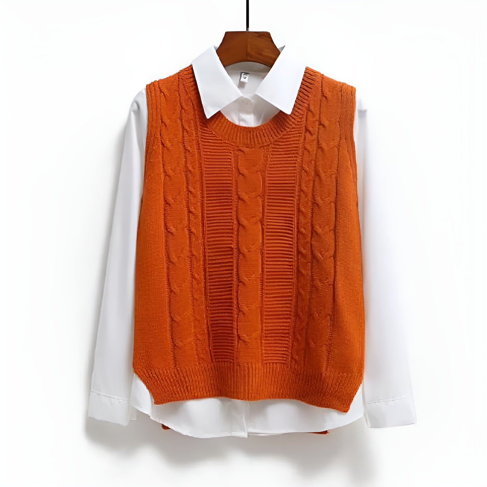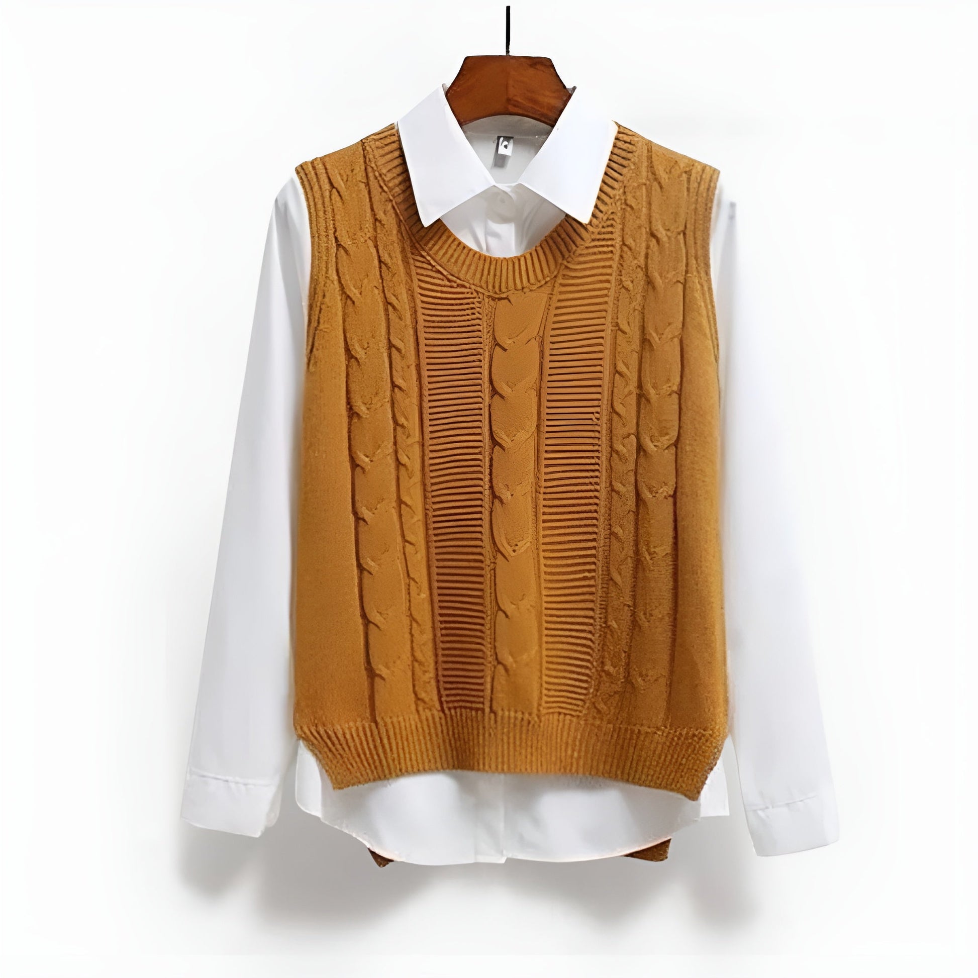 Elin stickad väst är det perfekta plagget för dig som vill kombinera stil, värme och bekvämlighet. Den trendiga västen är lika snygg över en skjorta som över en enkel tröja och ger din outfit en modern och avslappnad look – idealisk för både vardag och fika på stan.