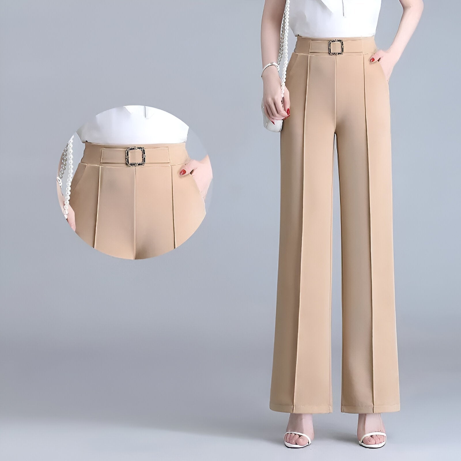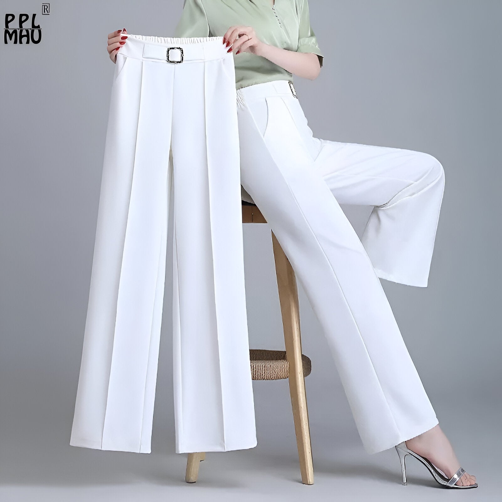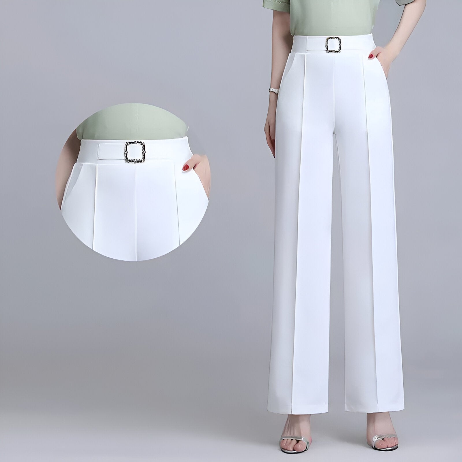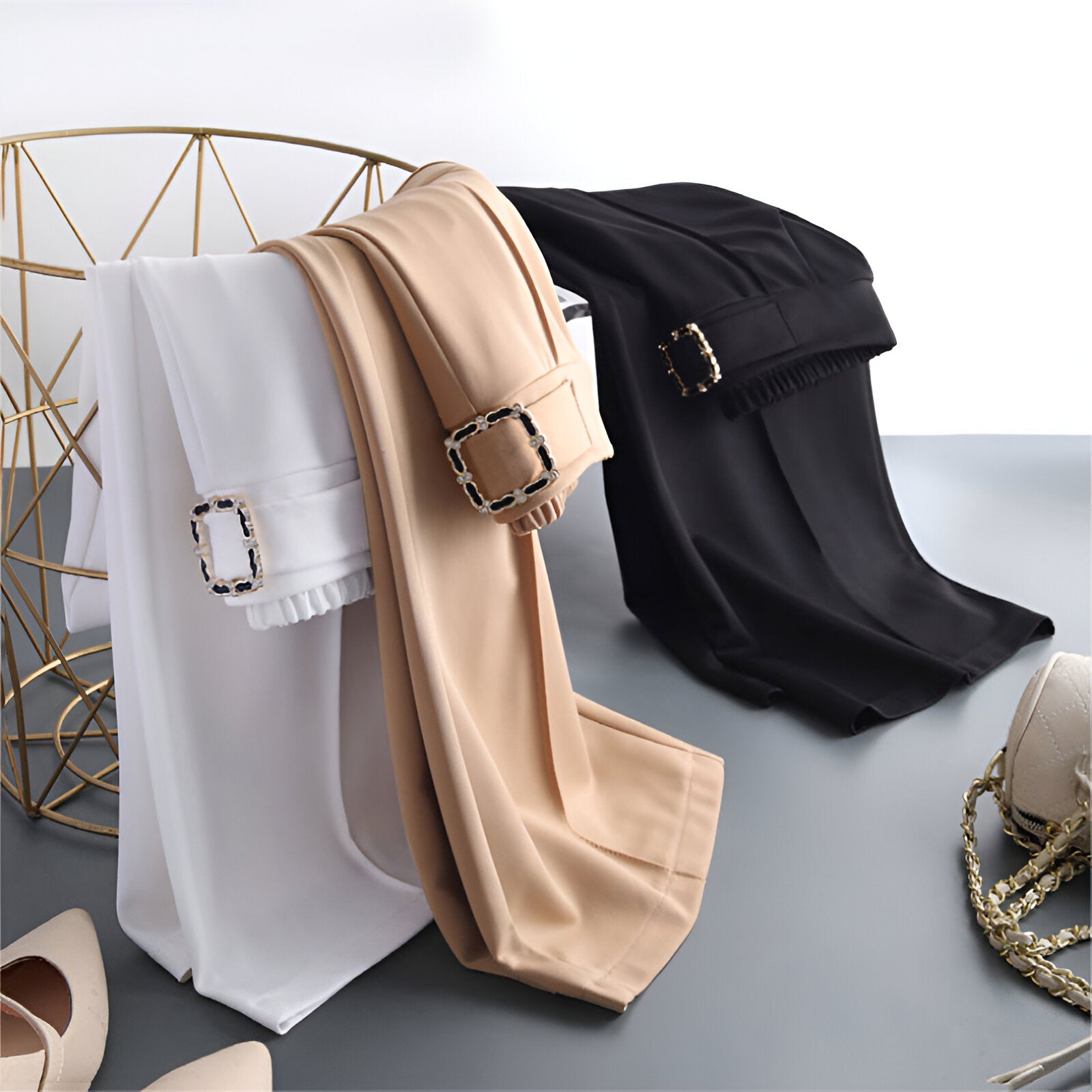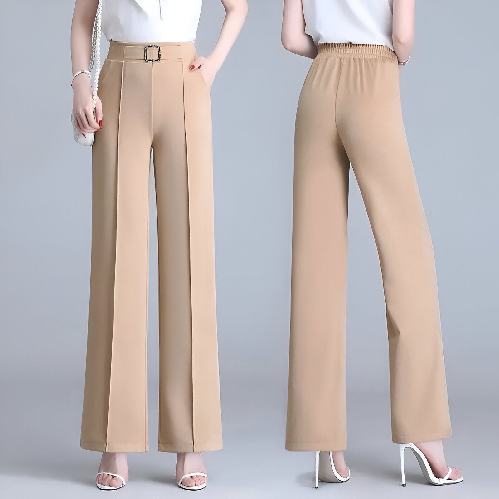 Lyxig komfort Dessa byxor är tillverkade av issilke och ger en mjuk, andningsbar känsla mot huden. Designen med hög midja smickrar inte bara din figur utan garanterar också komfort hela dagen, oavsett om du brunchar med vänner eller njuter av en avkopplande dag ute.
