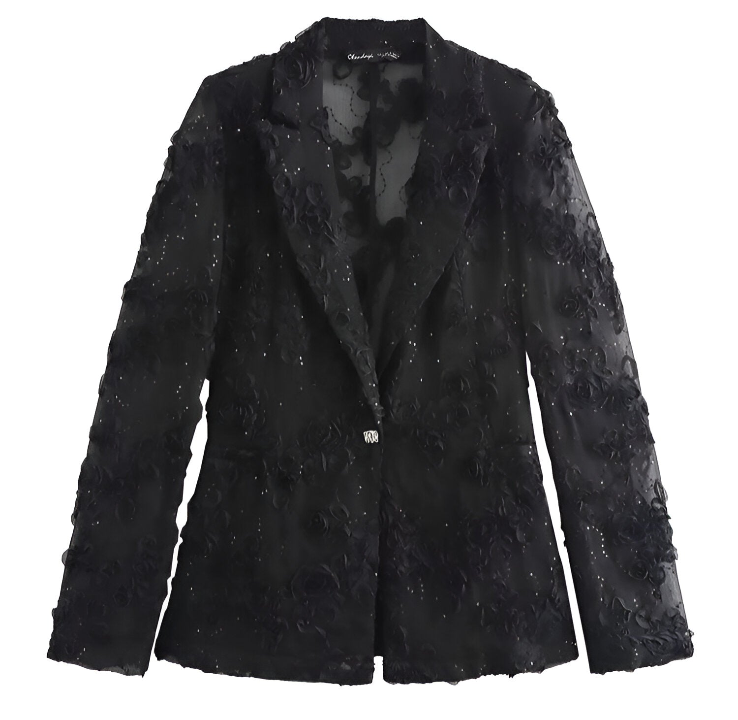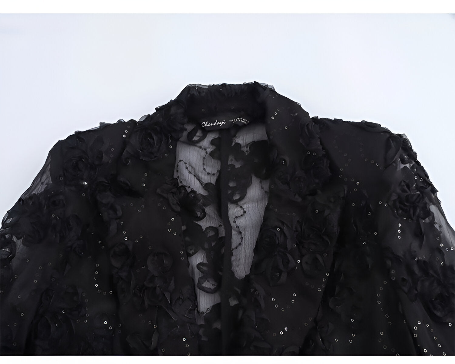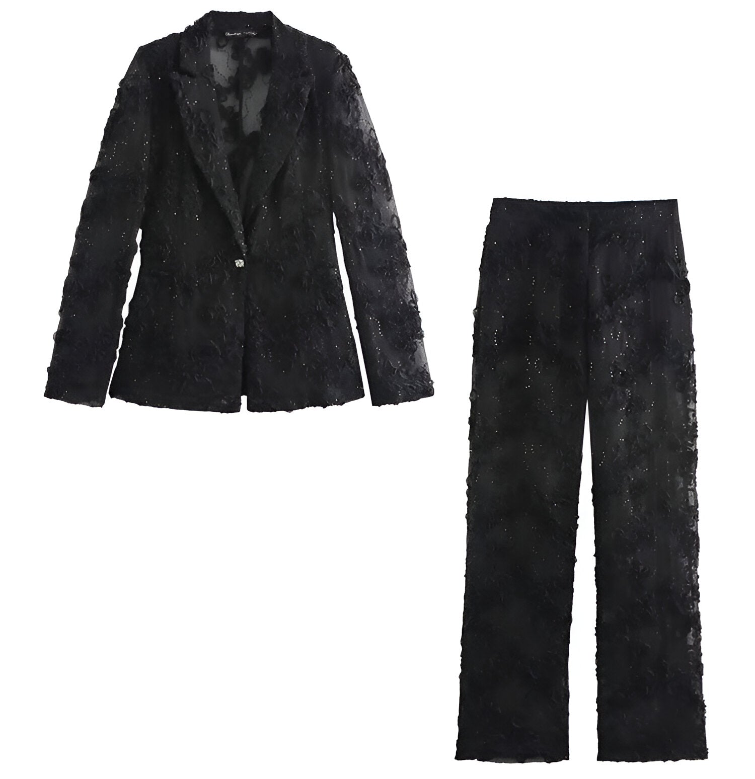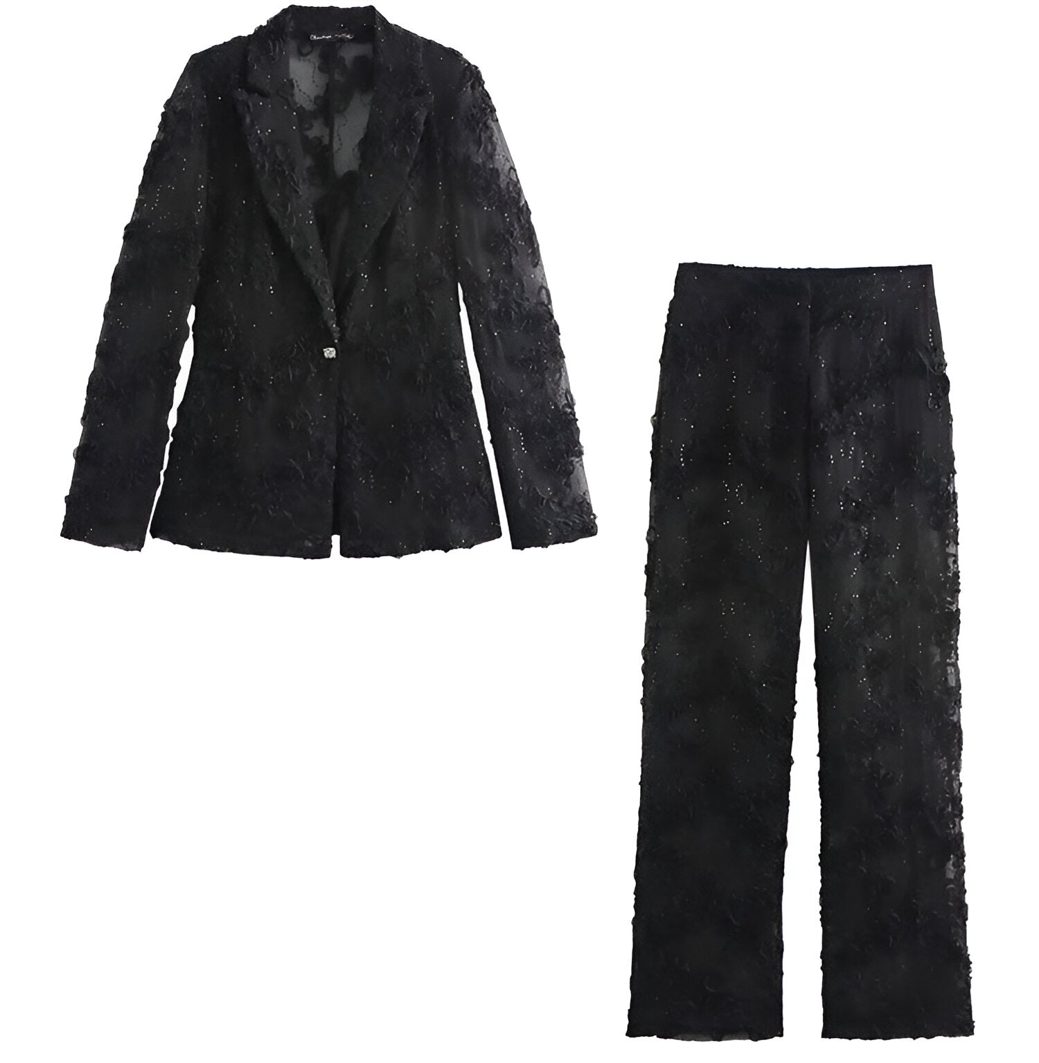 Kliv in i rampljuset med detta fantastiska 2-delade set som garanterat kommer att få folk att vända på huvudet. Föreställ dig att du bär detta eleganta set - den paljettbroderade kavajöverdelen fångar ljuset i varje rörelse, medan de halvgenomskinliga byxorna ger en touch av mystik och förförelse. Oavsett om det är en fest, en utekväll med vänner eller ett speciellt tillfälle kommer du att känna dig som kvällens stjärna. Njut av fri frakt och gör detta eleganta set till ditt idag.