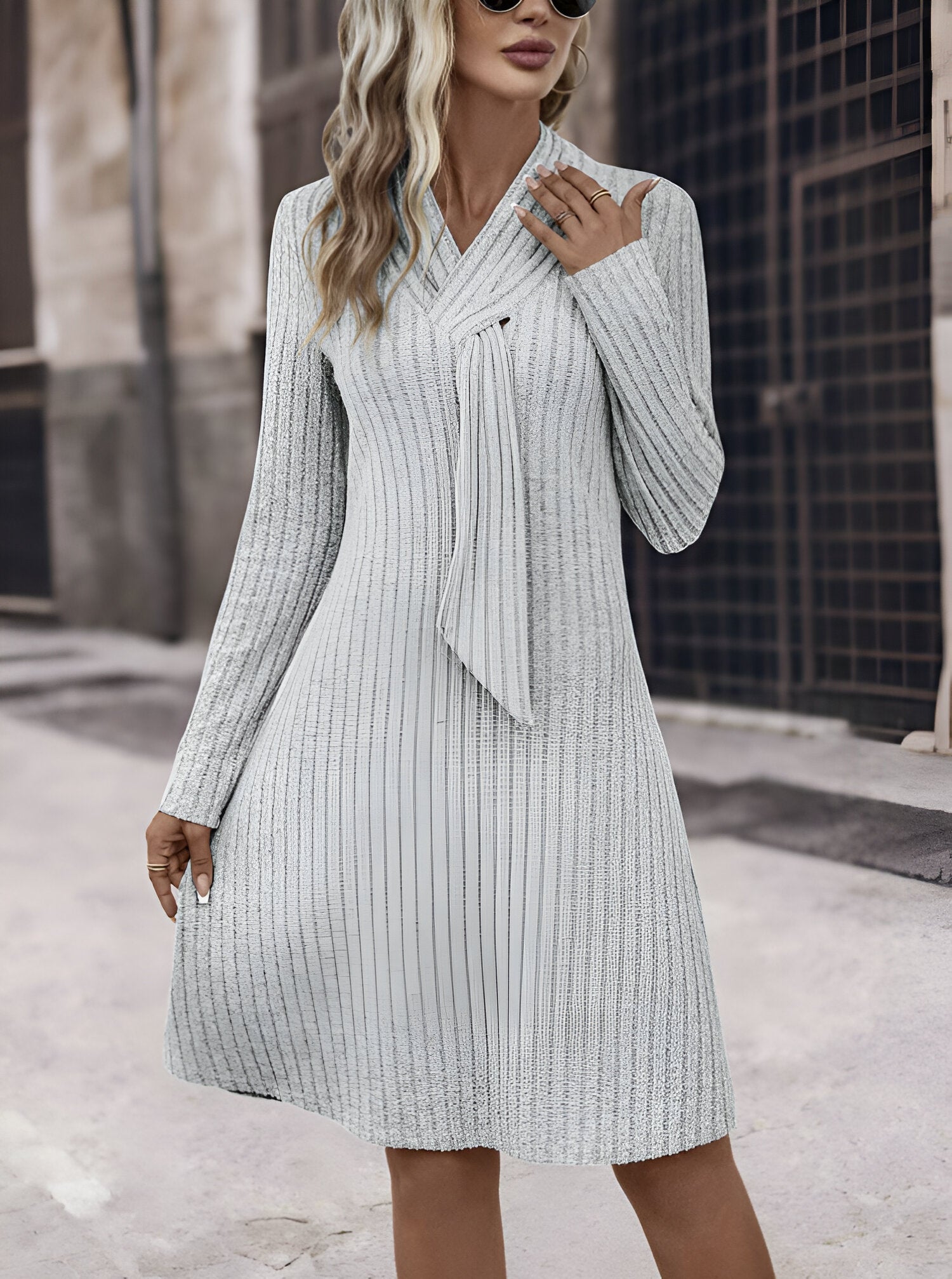 Den här vackra grå klänningen, som är designad för höst- och vintersäsongen, kombinerar elegans med ett mysigt snitt och kommer att bli ditt favoritplagg för alla tillfällen. Oavsett om du fikar med vännerna eller äter middag ute kommer du att känna dig elegant och självsäker utan ansträngning.