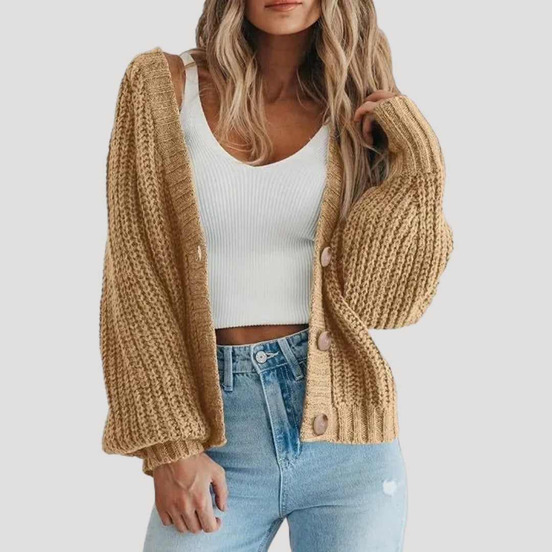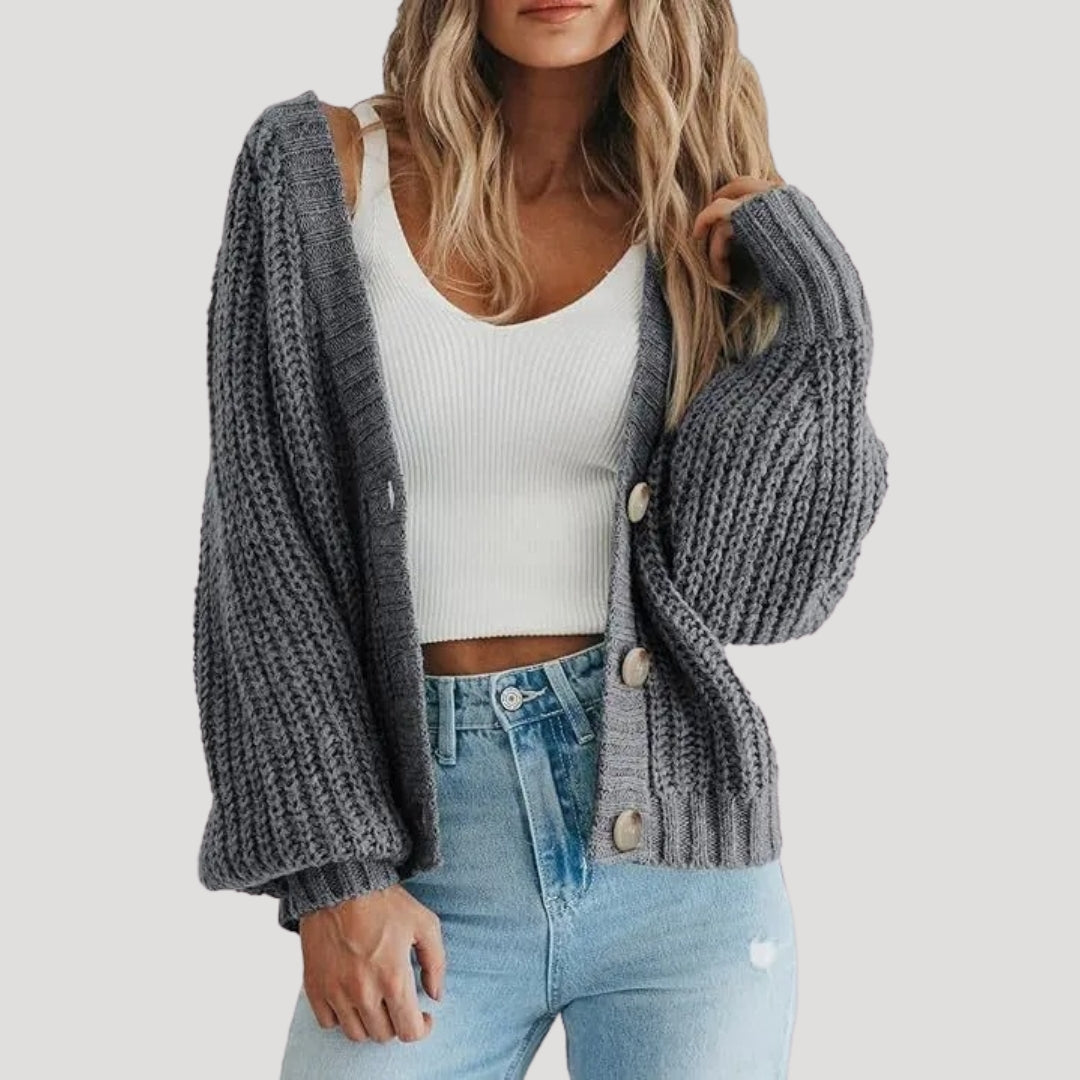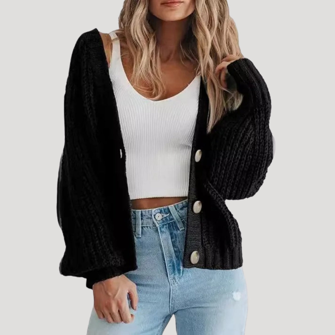 Freja är den perfekta koftan när du vill kombinera värme, komfort och stil. Den chunky stickade designen med djup V-hals och dekorativa knappar ger en både avslappnad och elegant look. Perfekt att bära över en topp eller blus, oavsett om du klär dig för vardag eller en mer polerad outfit.