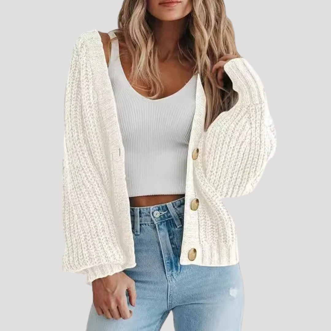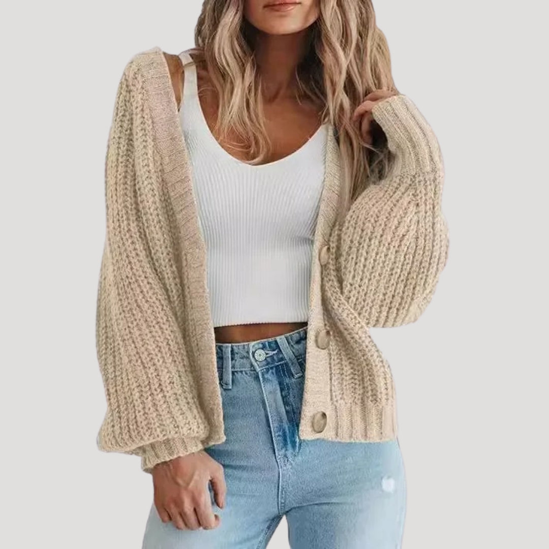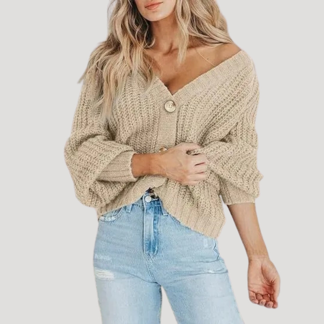 Freja är den perfekta koftan när du vill kombinera värme, komfort och stil. Den chunky stickade designen med djup V-hals och dekorativa knappar ger en både avslappnad och elegant look. Perfekt att bära över en topp eller blus, oavsett om du klär dig för vardag eller en mer polerad outfit.