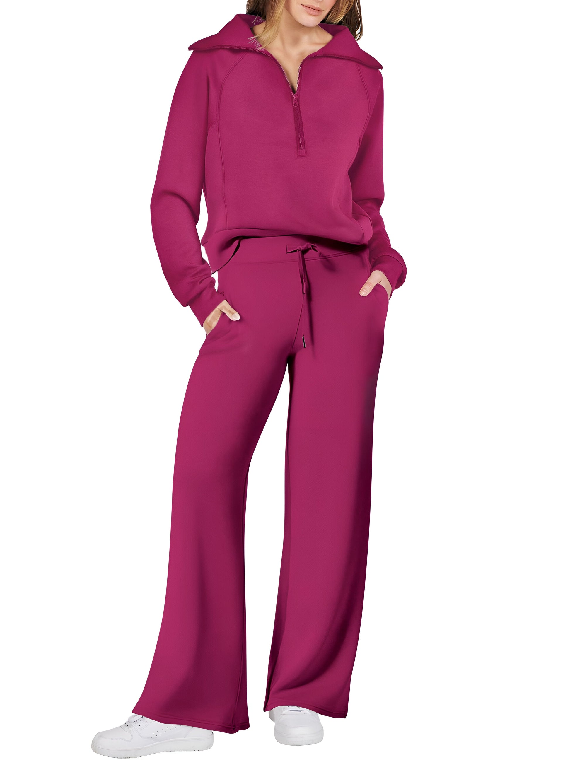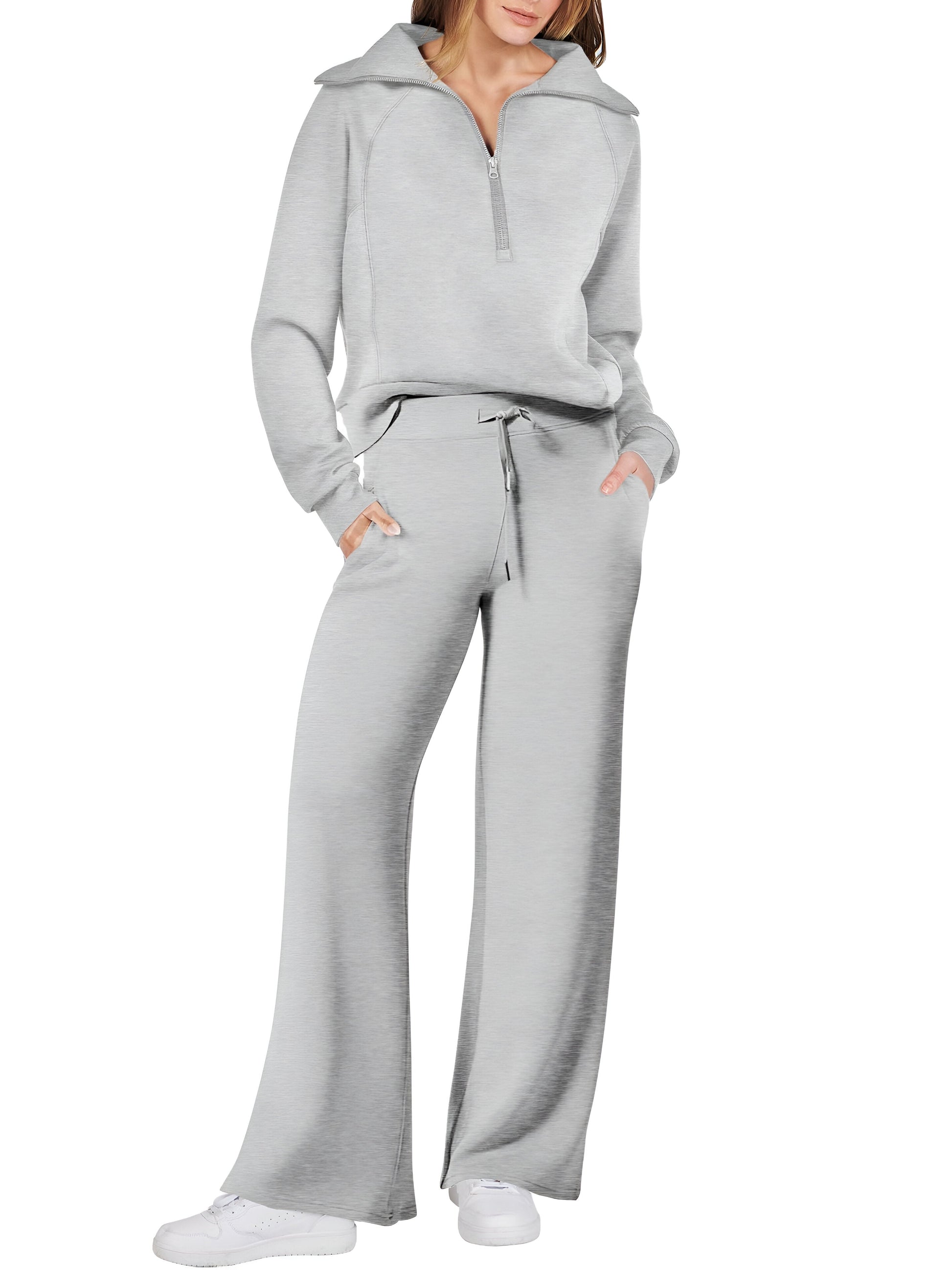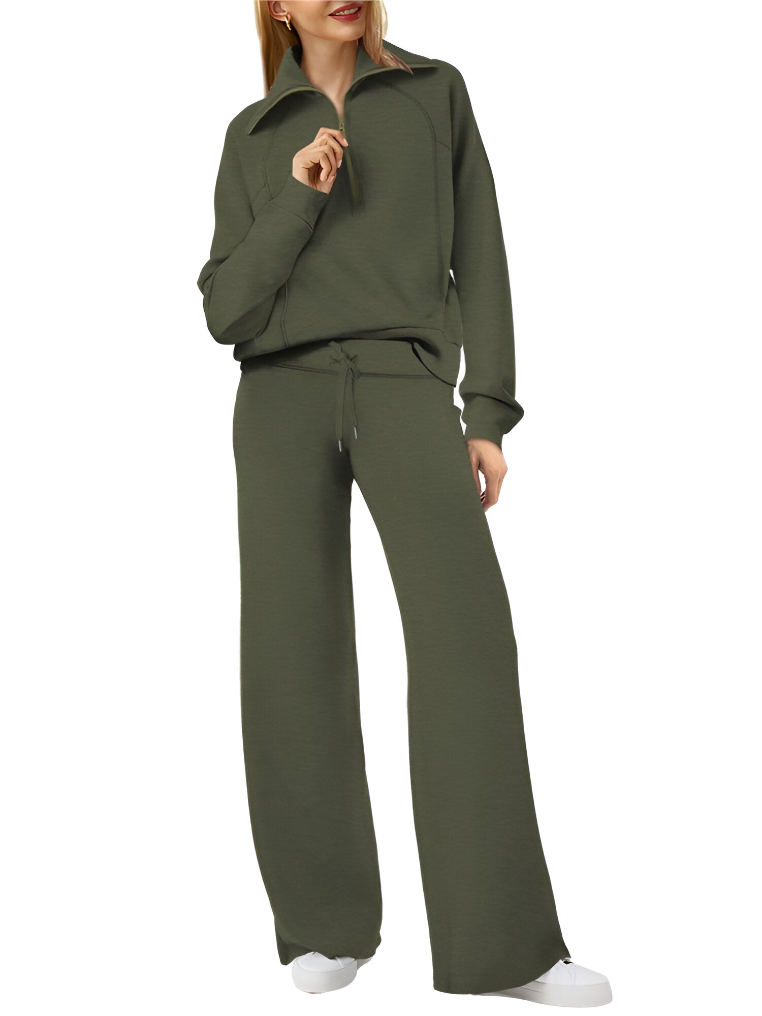 Detta eleganta tvådelade set består av en långärmad sweatshirt med smickrande knytband i midjan och vida byxben, perfekt för krispiga höstdagar. Tänk dig att känna dig självsäker och avslappnad oavsett om du går ärenden eller njuter av en lugn promenad i parken.