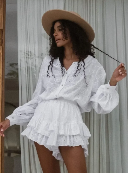 Gisela - Vit långärmad skjorta och shorts i ett se