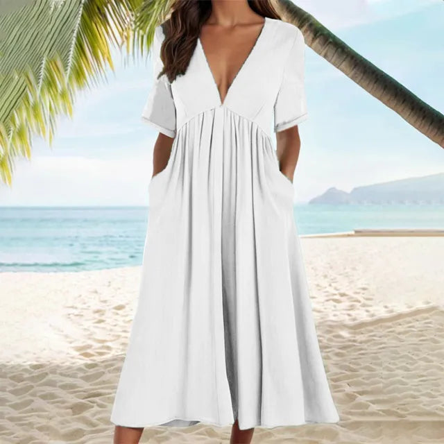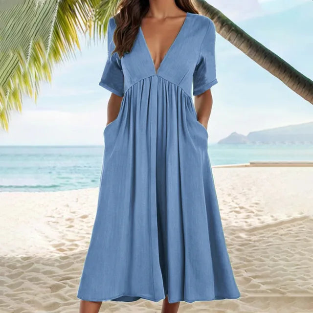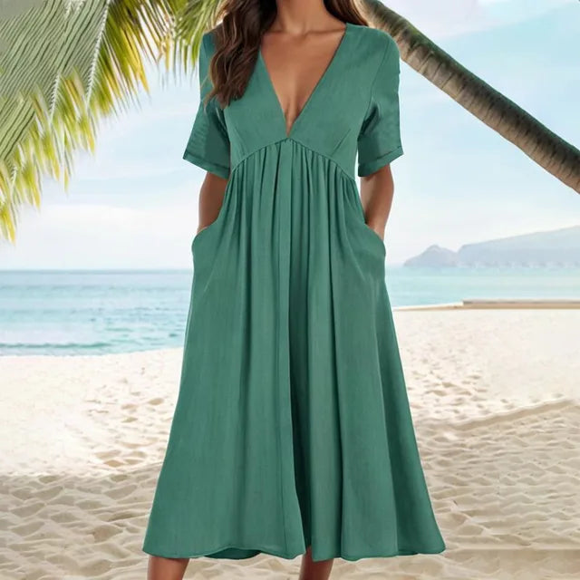 Haiya - Veckad klänning med djup V-ringning och fickor
