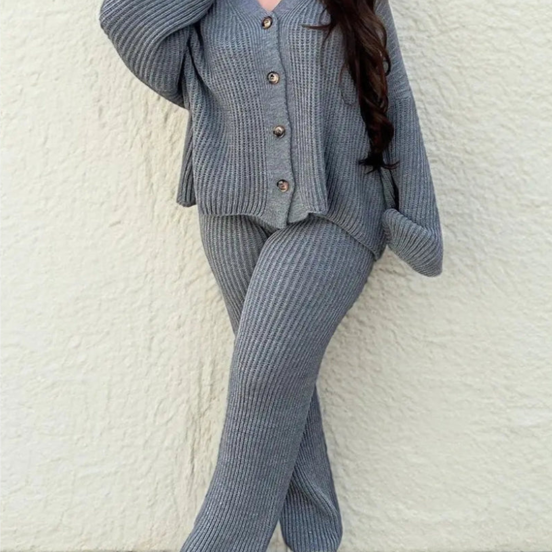 Upptäck Isabelle setet – en perfekt förening av stil och komfort. Setet består av en v-ringad cardigan och vida byxor i ett mjukt, ribbat stickat material som erbjuder både elegans och funktionalitet. Mjukt och ribbat stickat material för optimal komfort, stilren design som passar alla tillfällen, och praktisk mångsidighet för vardag och fest. Ett mångsidigt tillskott som höjer din garderob till en ny nivå.