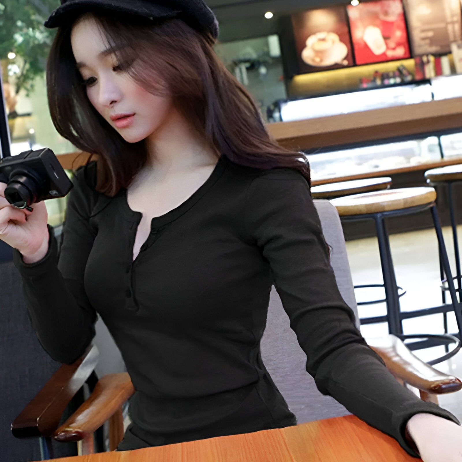 2. Tidlös stil med moderna detaljer Med sin klassiska knappdesign och monokroma look ger den här toppen en enkel, minimalistisk touch till alla outfits. Kombinera den med jeans eller kjol för en look som passar alla tillfällen.