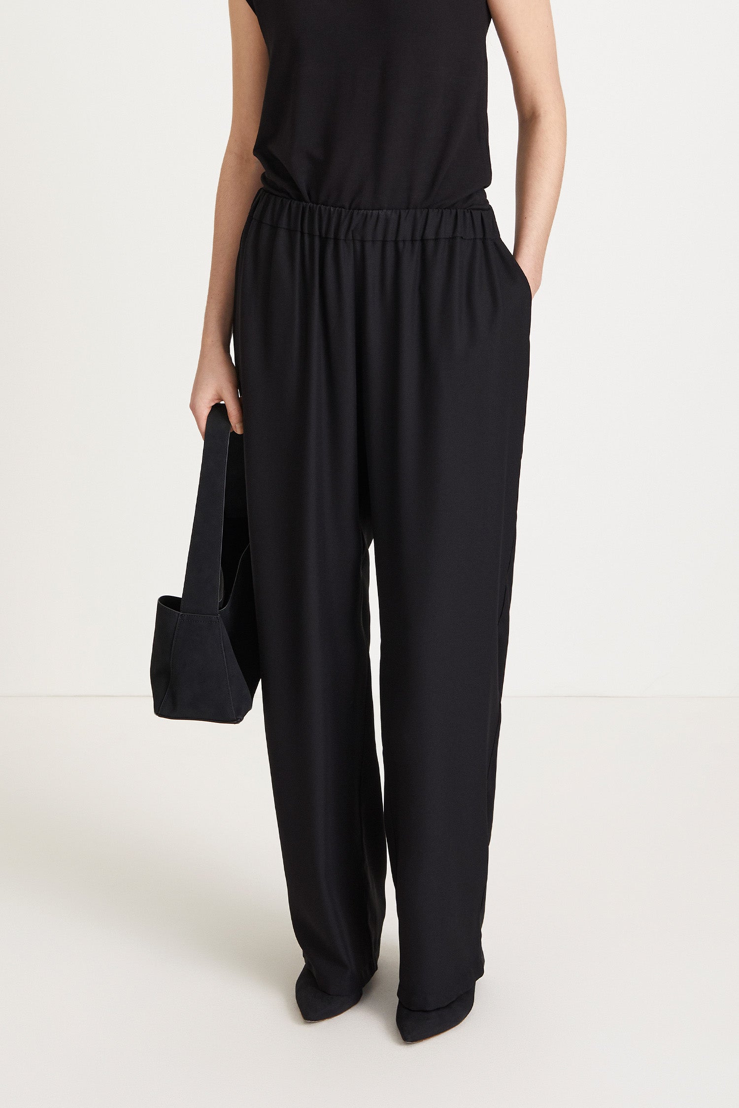 Kliv in i enkel elegans med Kajsa | Vida Crepebyxor, designade för en avslappnad men sofistikerad look. Tillverkade av mjuk, matt crepe, erbjuder dessa byxor ett följsamt fall och en lätt känsla. Med en bred resårmidja och snedställda fickor kombinerar de både stil och funktionalitet, vilket gör dem perfekta för alla tillfällen.