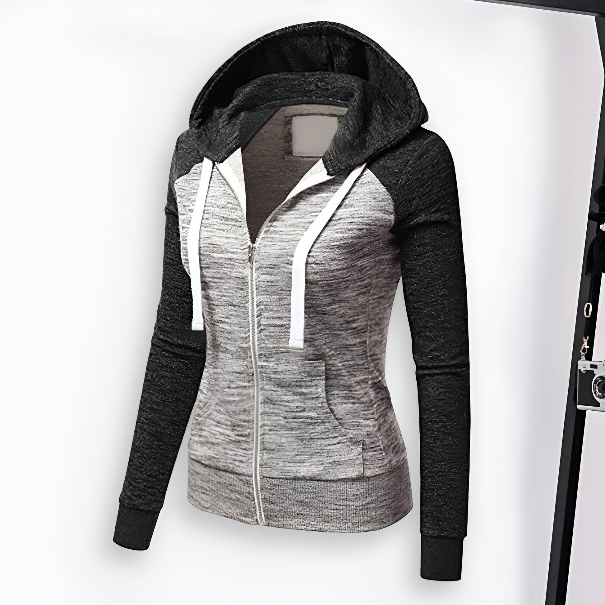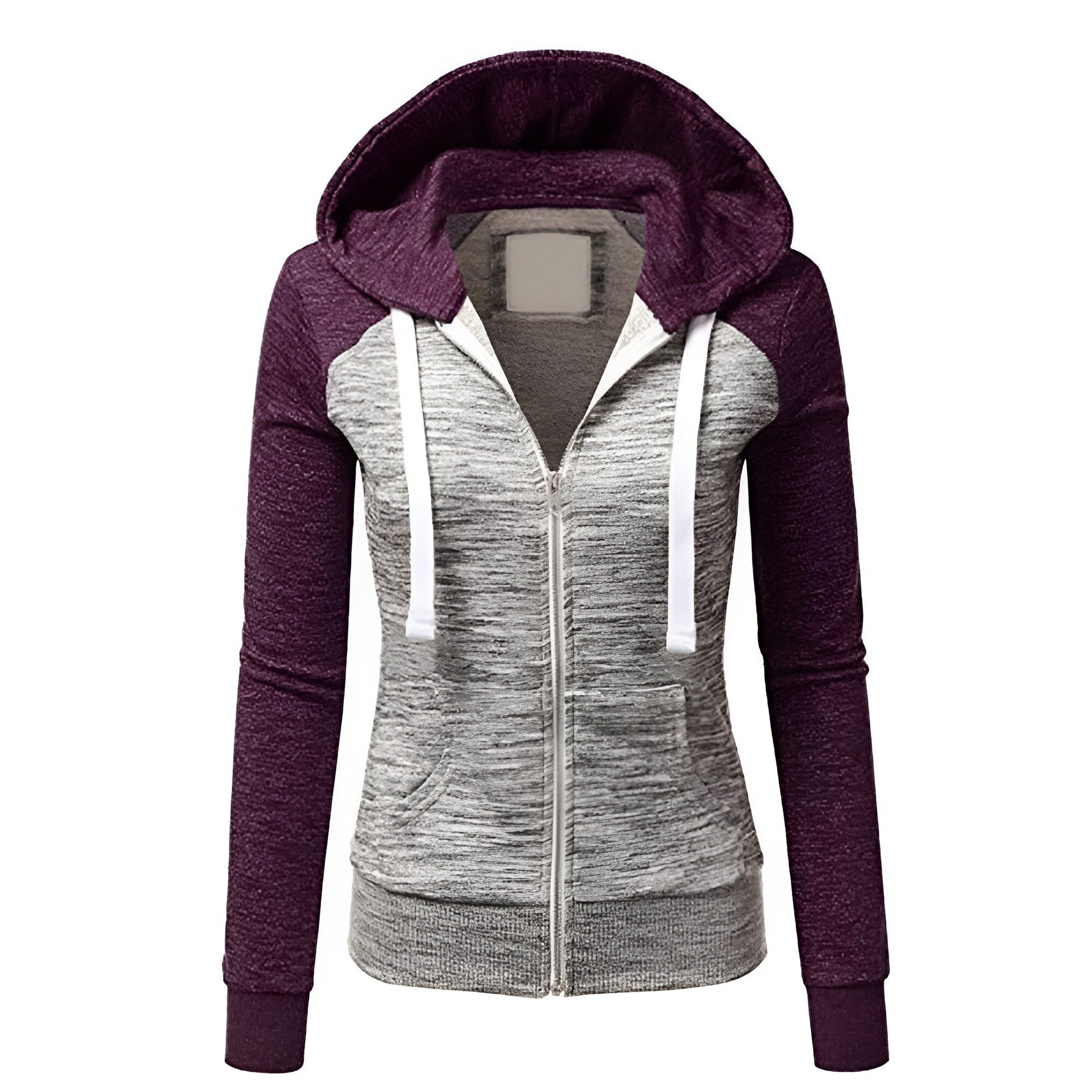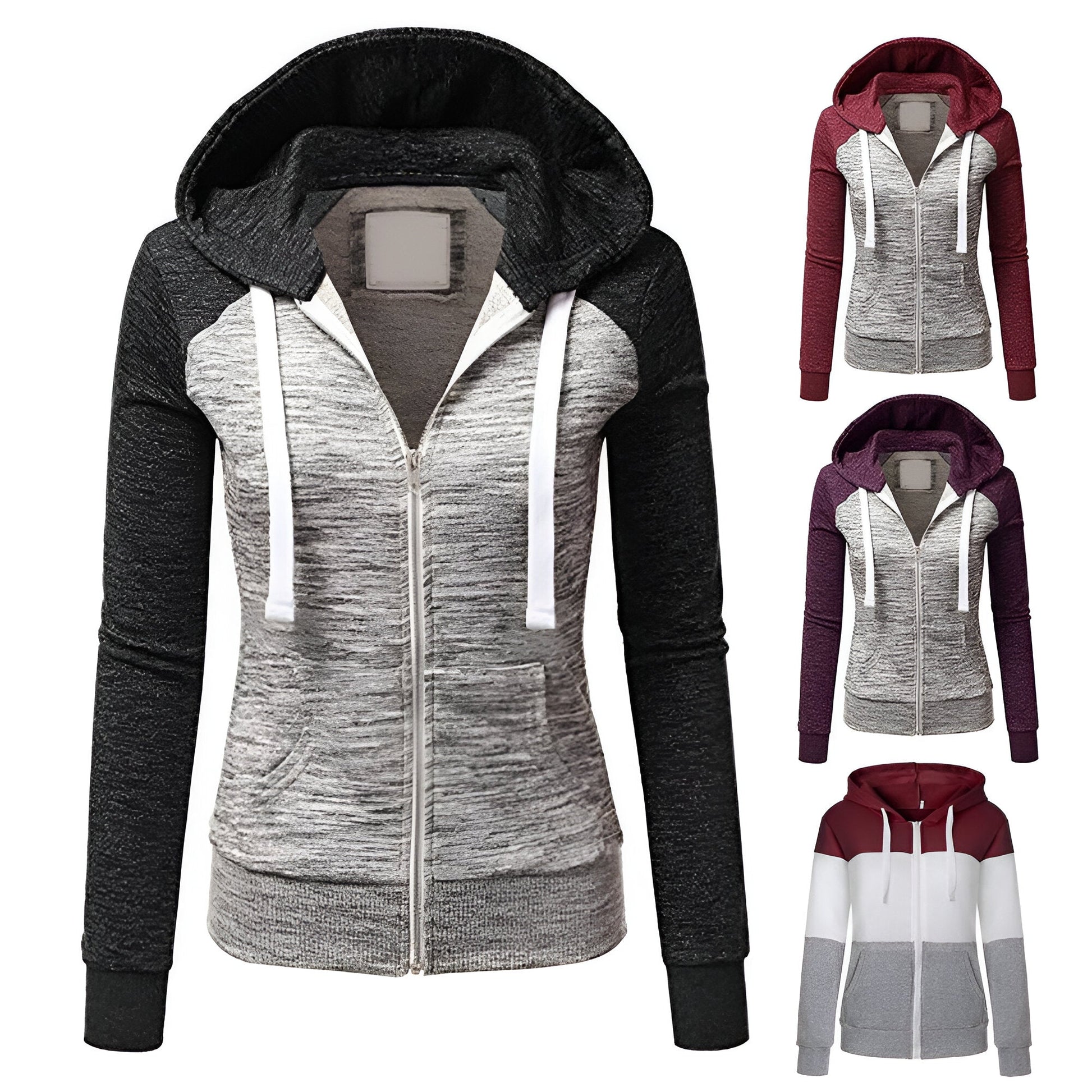 Tänk dig att gå ut en kylig vårdag och känna dig ombonad, snygg och enkelt chic. Denna sweatshirtjacka är designad för att hålla dig varm utan att göra avkall på stilen. Med sin mysiga huva med dragsko, eleganta färgblocksdesign och praktiska fickor är den den perfekta kombinationen av komfort och mode för din vårgarderob.