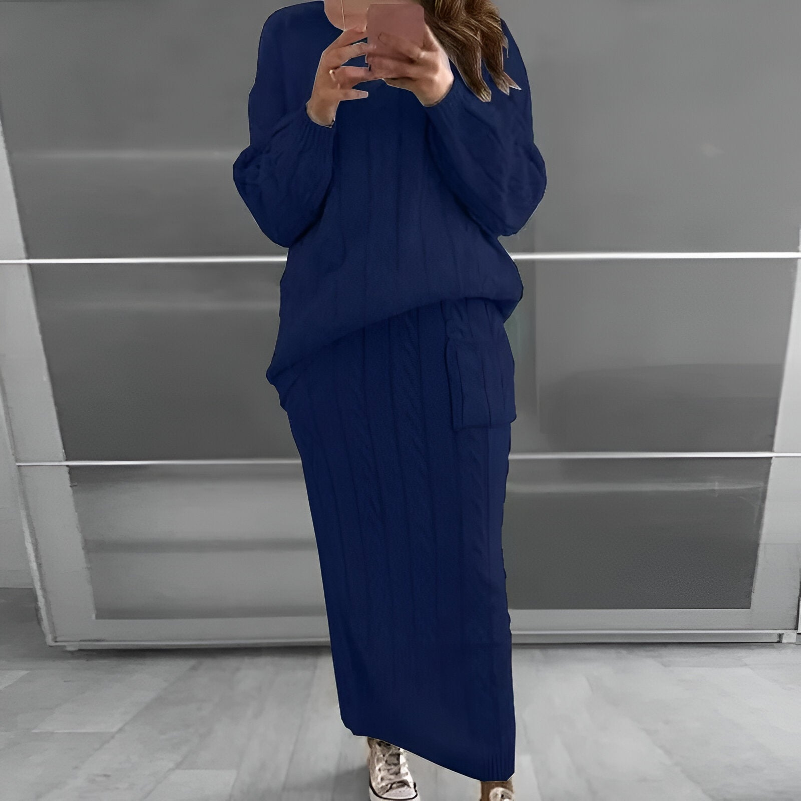 Tänk dig att gå genom höst och vinter med den perfekta blandningen av komfort och stil. Det här mysiga setet med stickad tröja och kjol ger en chic, enkel look som är perfekt för kyliga dagar och kalla nätter. Oavsett om du promenerar på gatorna eller är på väg ut för att fika med vännerna kommer den här outfiten att hålla dig varm och snygg. Föreställ dig att du sveper in dig i det mjuka, stickade tyget och njuter av både komfort och mode vart du än går.