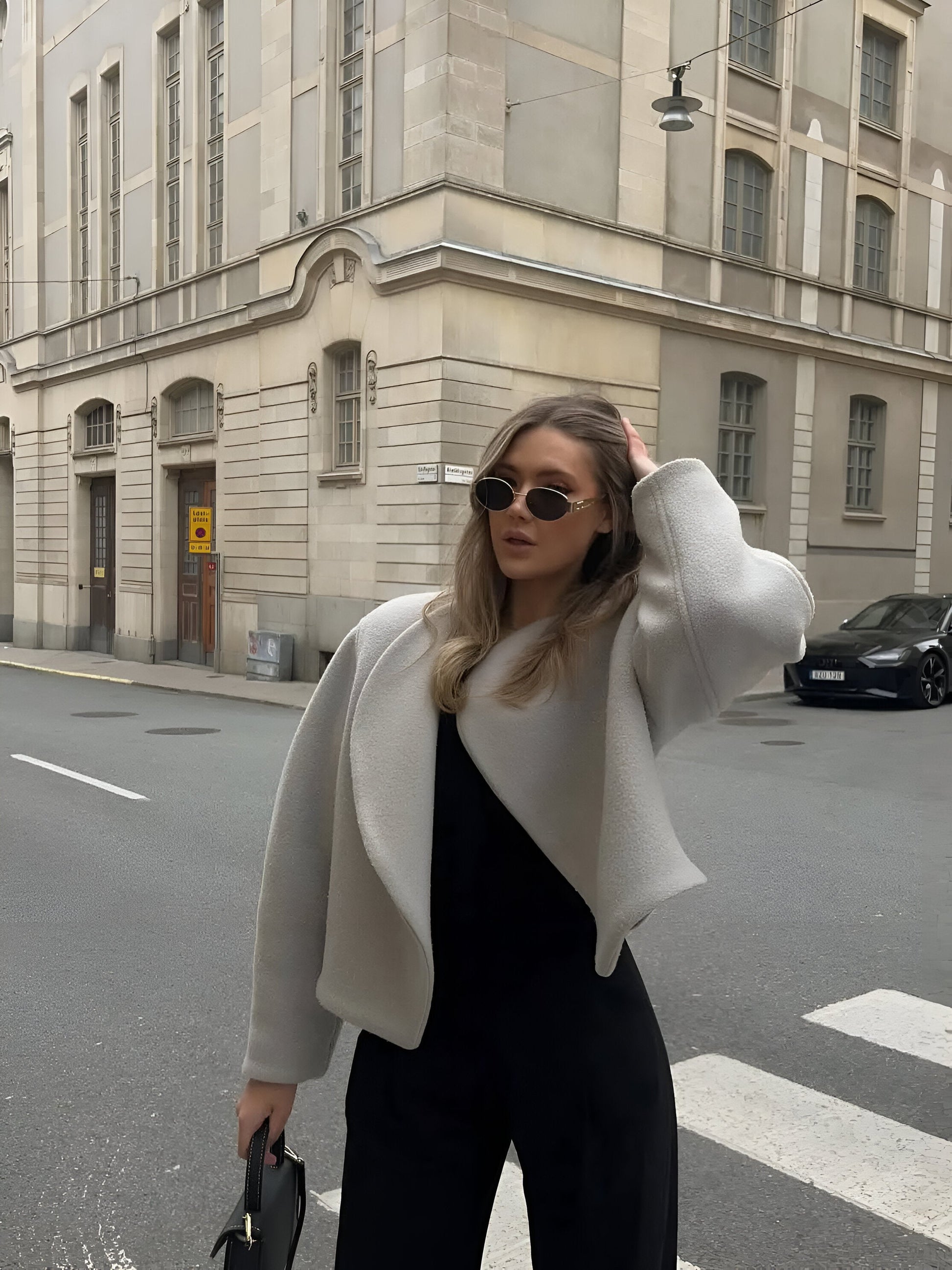 Värme och komfort Den här kappan ger en perfekt balans mellan stil och funktionalitet. Den mjuka, varma ullen håller dig varm under kalla dagar, medan den croppade skärningen framhäver din silhuett.