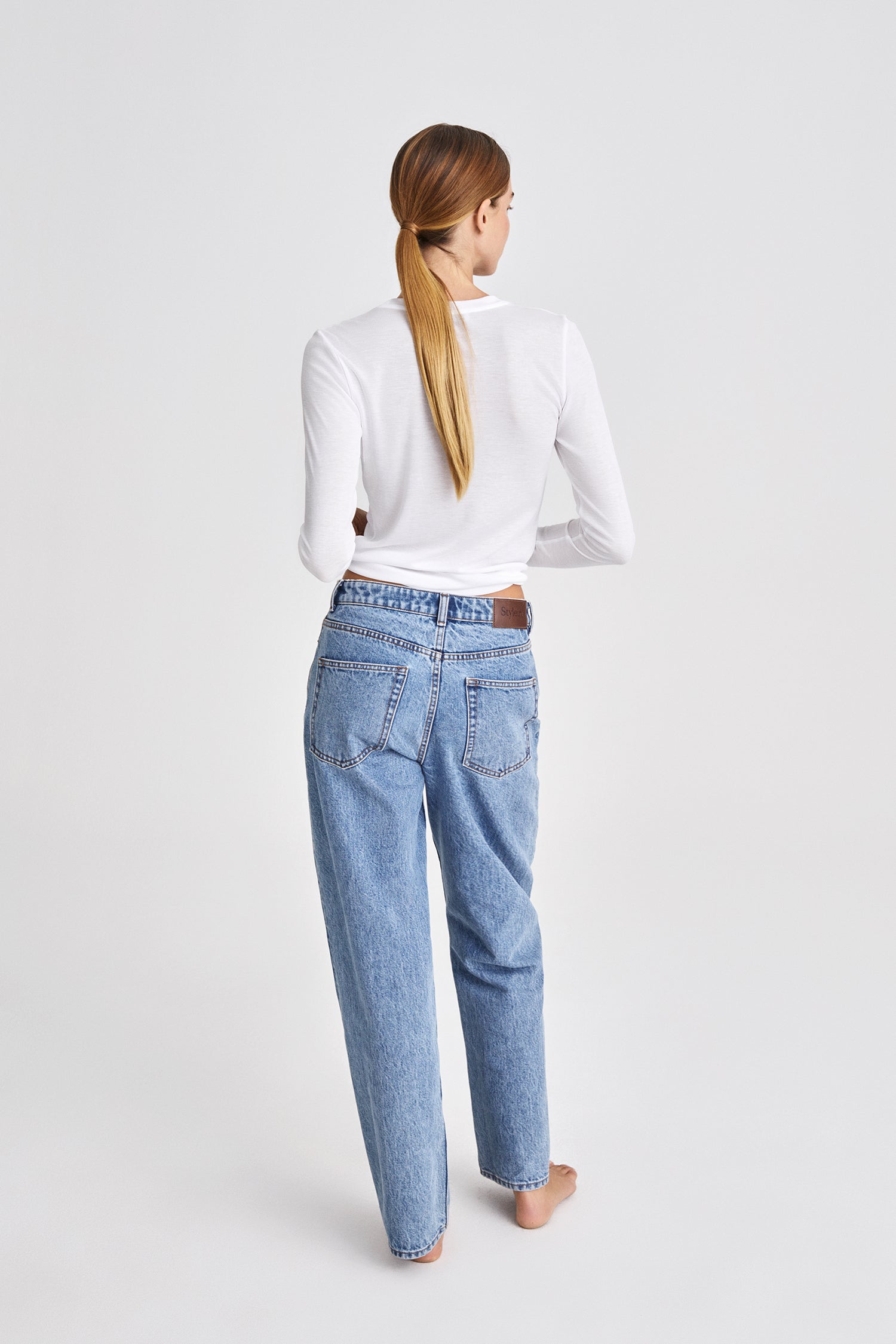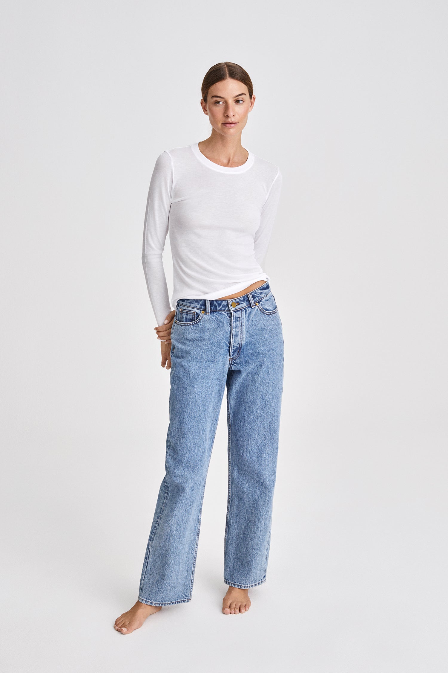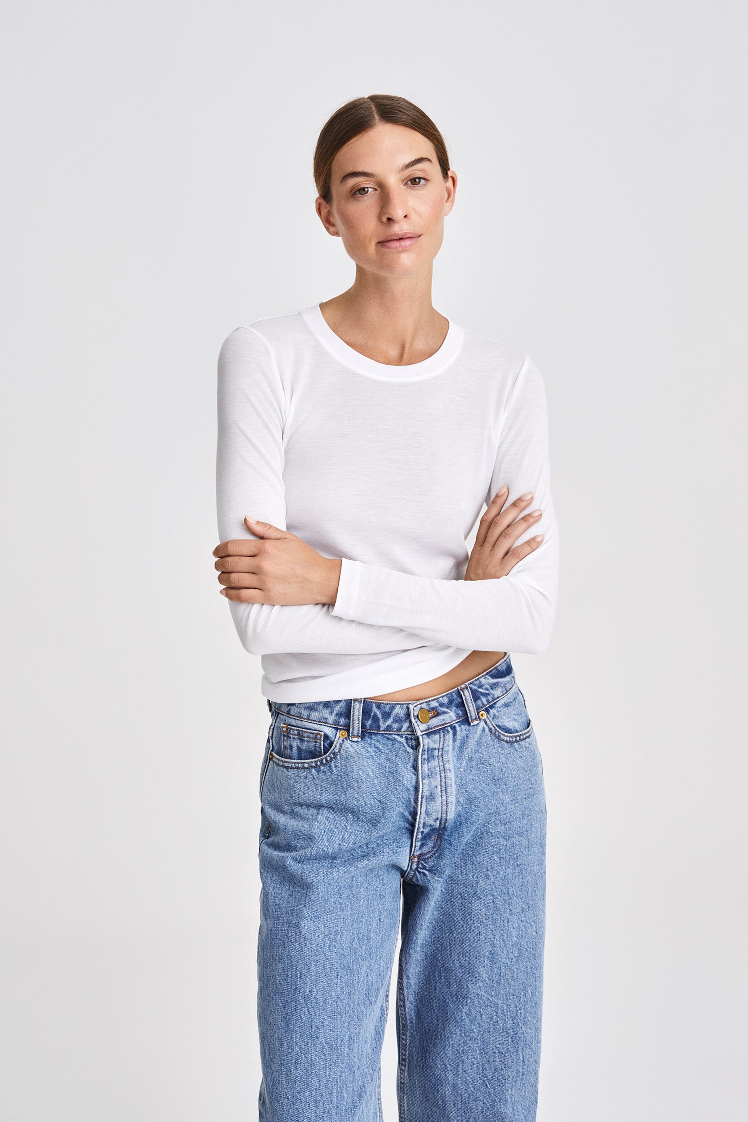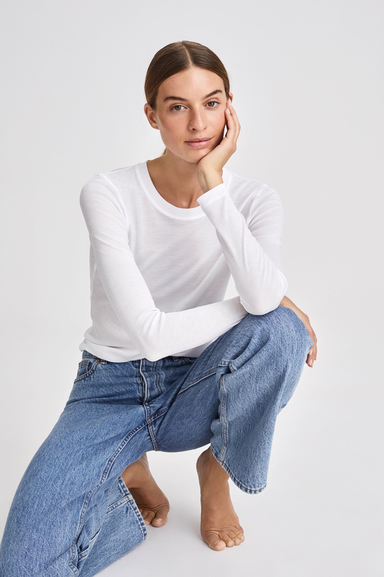 Möt Moa | Klassisk vit långärmad topp, en mångsidig och tidlös bas i varje garderob. Tillverkad av mjukt, stretchigt material ger den en smickrande passform och lätt komfort för hela dagen. Den minimalistiska designen och den runda halsringningen gör den perfekt för både avslappnade och mer eleganta outfits, vilket säkerställer en stilren look vid alla tillfällen.