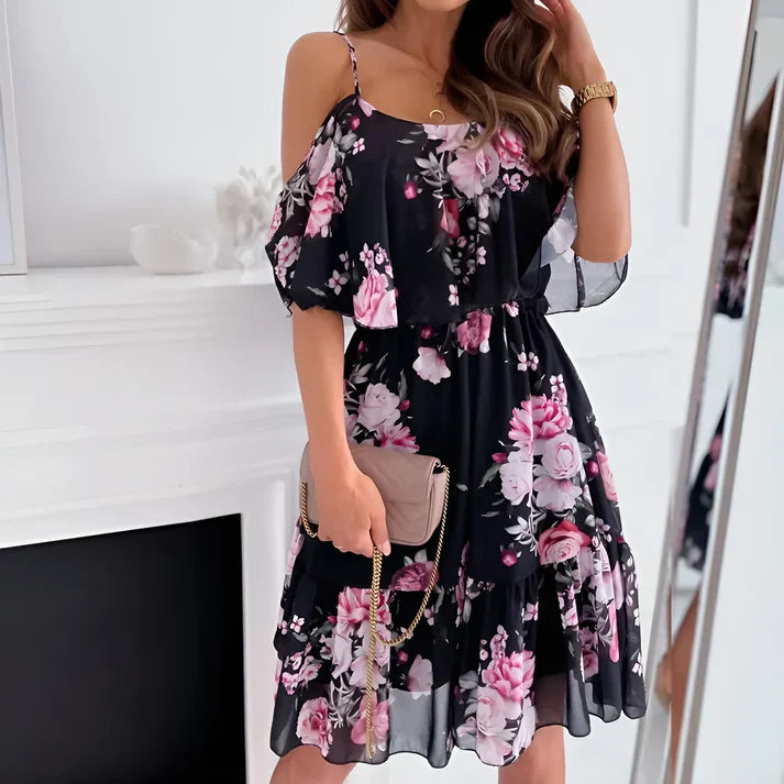 Nilla blommig klänning kombinerar mjuk elegans med en luftig passform som känns lika bekväm som den ser fantastisk ut. Den blommiga designen ger en romantisk touch, samtidigt som den eleganta silhuetten gör att du alltid känner dig välklädd – oavsett tillfälle.