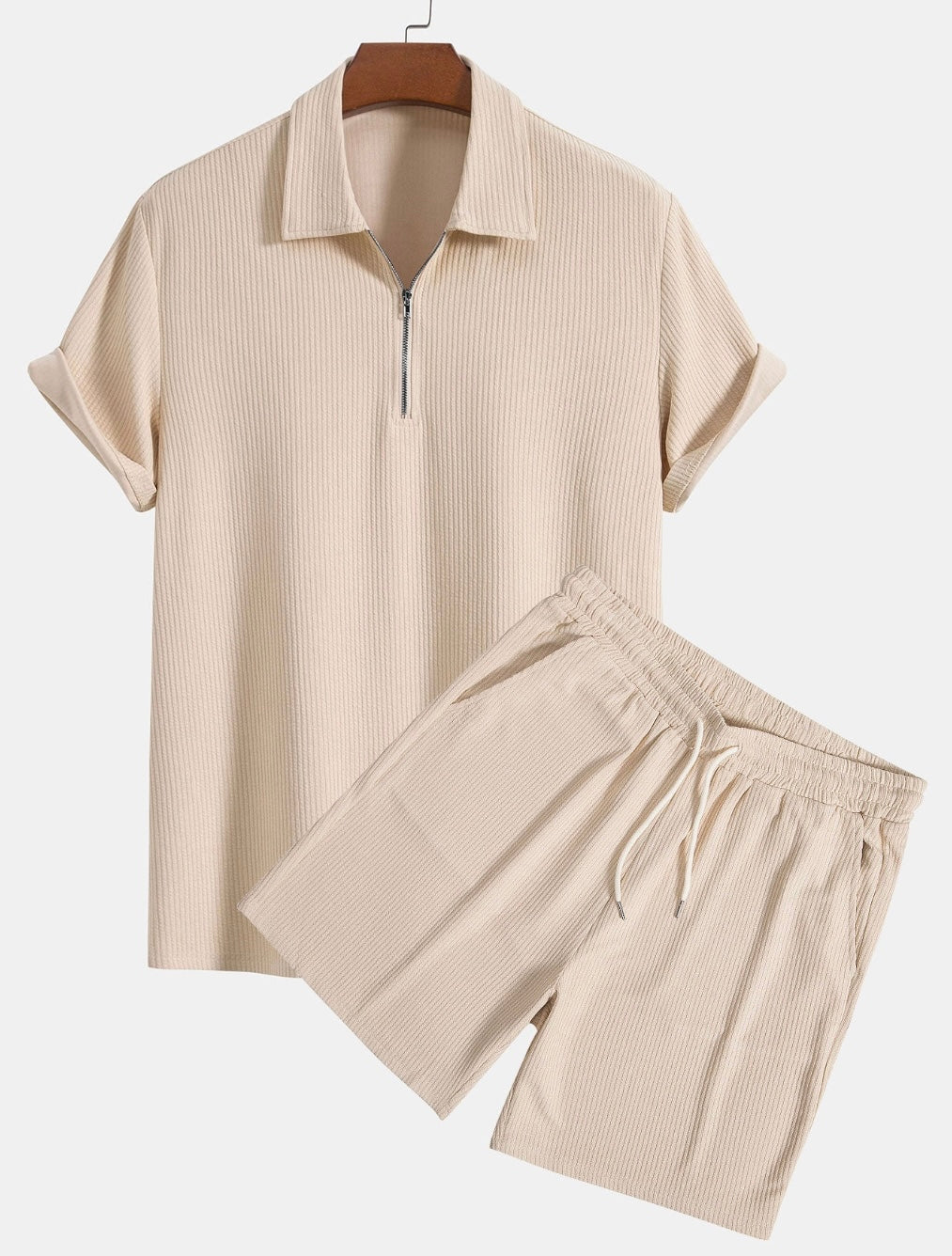 Noah är det ultimata setet för män som vill kombinera komfort och stil i ett enda grepp. Det ribbade materialet ger en trendig struktur, medan dragkedjan och den skräddade passformen gör det till ett självklart val för både vardag och semester.