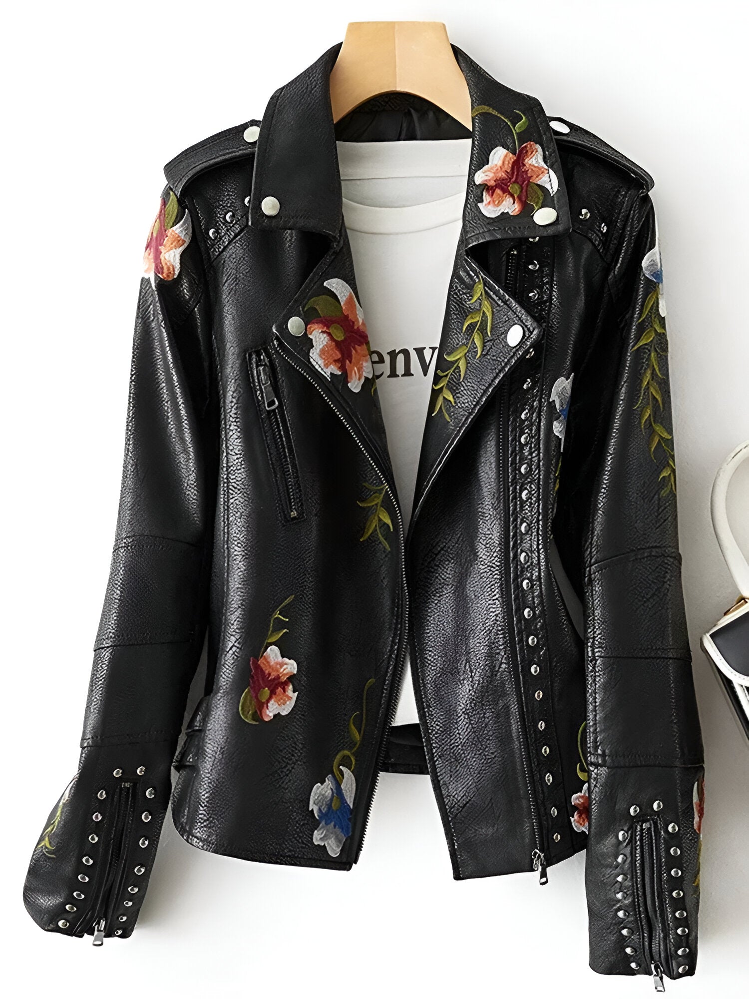 Upptäck din djärva och eleganta sida med denna iögonfallande, vintageinspirerade skinnjacka. Jackan är tillverkad i mjukt konstläder och har ett intrikat blomsterbroderi för en unik retrokänsla. Med en uppfälld krage och en klassisk bikersnitt kombinerar den punkiga kanter med tidlös elegans. Tänk dig att gå genom stadens gator eller träffa vänner på ditt favoritcafé - du kommer att vända huvuden vart du än går.