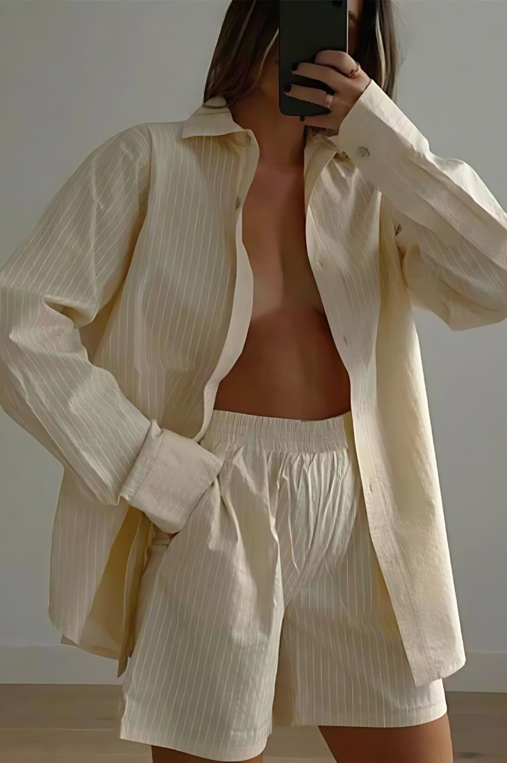 Ge din sommarstil en sofistikerad uppgradering med Rut kortbyxor och blusset. Detta set kombinerar funktion och stil med elastiska shorts som ger en bekväm och flexibel passform, högkvalitativt material för långvarig komfort, samt ett tidlöst randigt mönster som passar för alla tillfällen.