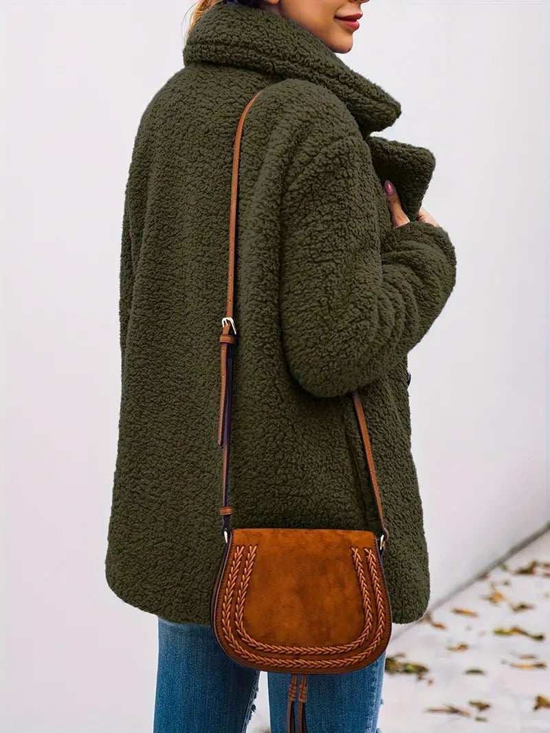 Tänk dig att svepa in dig i lyxen av denna eleganta teddyjacka, perfekt för kyliga höst- och vinterdagar. Med sin dubbelknäppta design och varma långa ärmar erbjuder den här jackan inte bara stil utan också oöverträffad komfort.