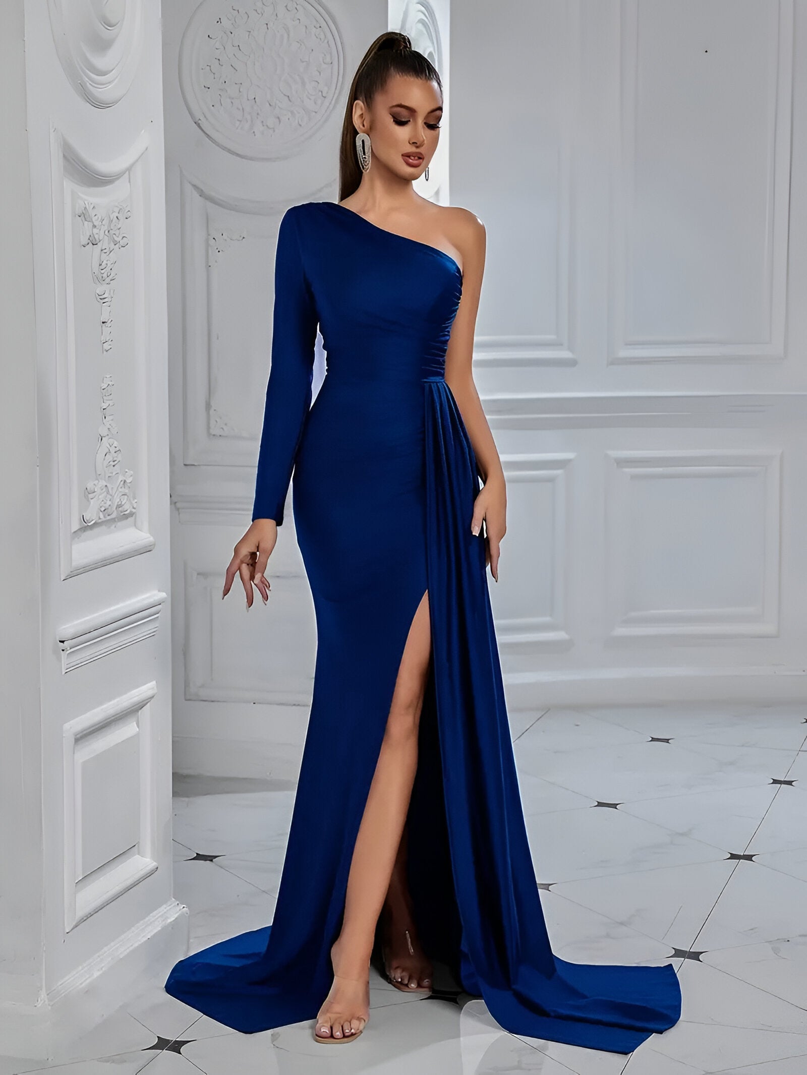 Ta plats i rampljuset med denna lyxiga, ensidiga, draperade sidenklänning. Denna eleganta aftonklänning är perfekt för oförglömliga utekvällar och erbjuder både sofistikering och komfort. Oavsett om du ska gå på en glamorös fest eller en formell bankett kommer du att känna dig fantastisk och självsäker hela kvällen.