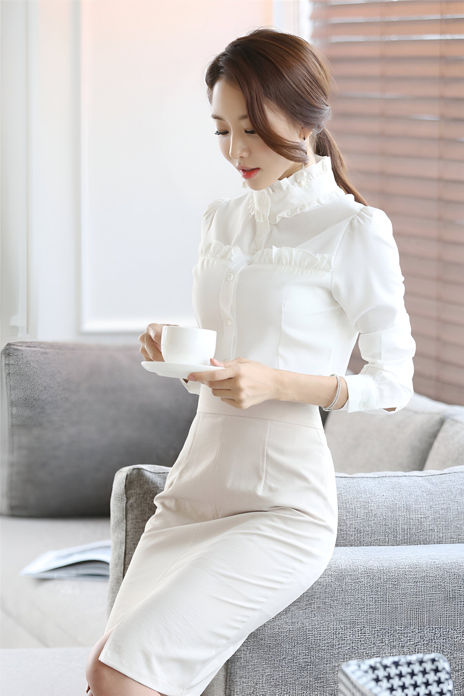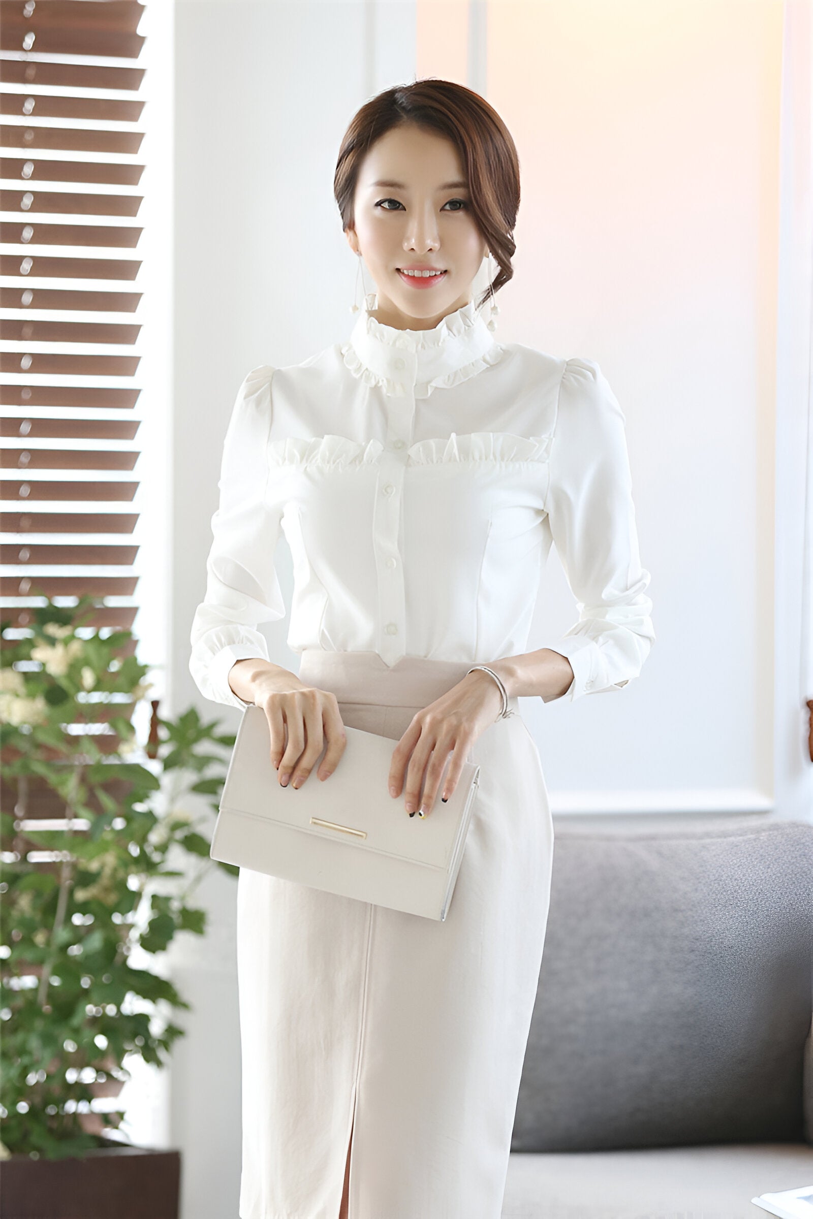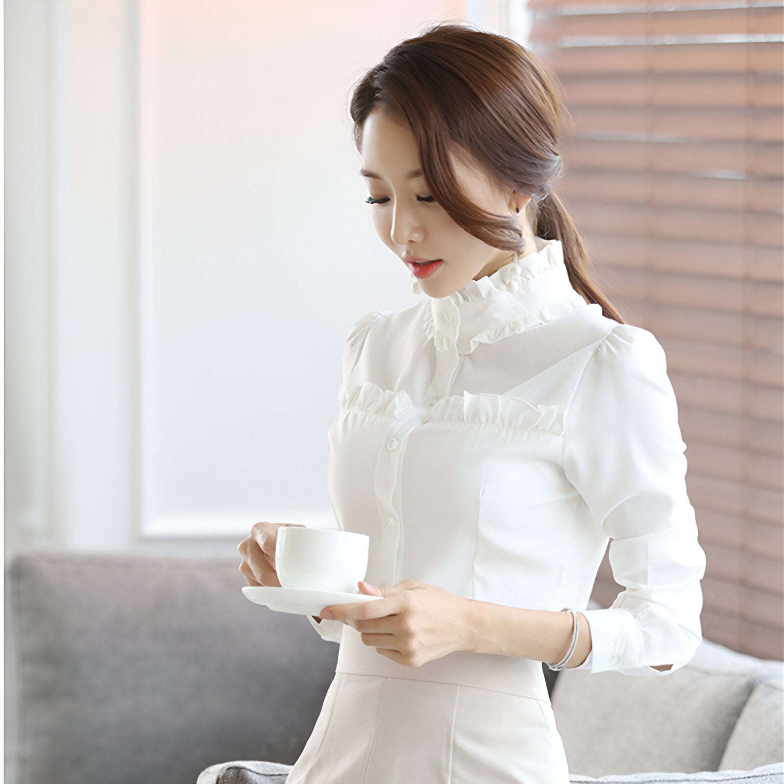 Tänk dig att gå in i våren med en blus som är ett uttryck för elegans och komfort. Den här snygga långärmade skjortan med sofistikerad ståkrage är perfekt för både professionella tillfällen och avslappnade utflykter. Du kommer att känna dig självsäker och sofistikerad, oavsett tillfälle.