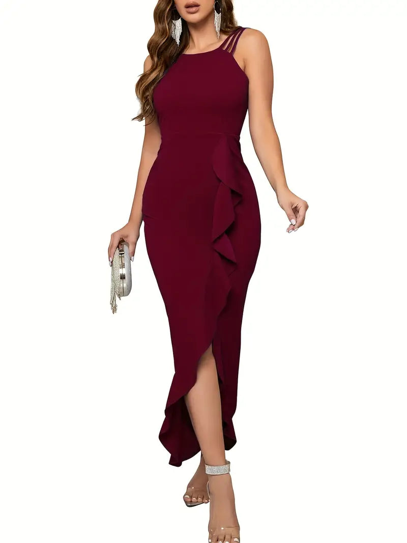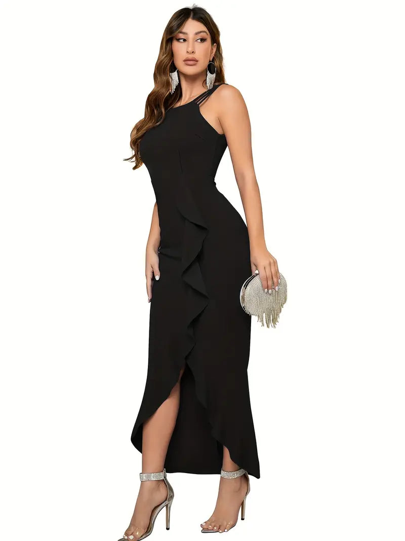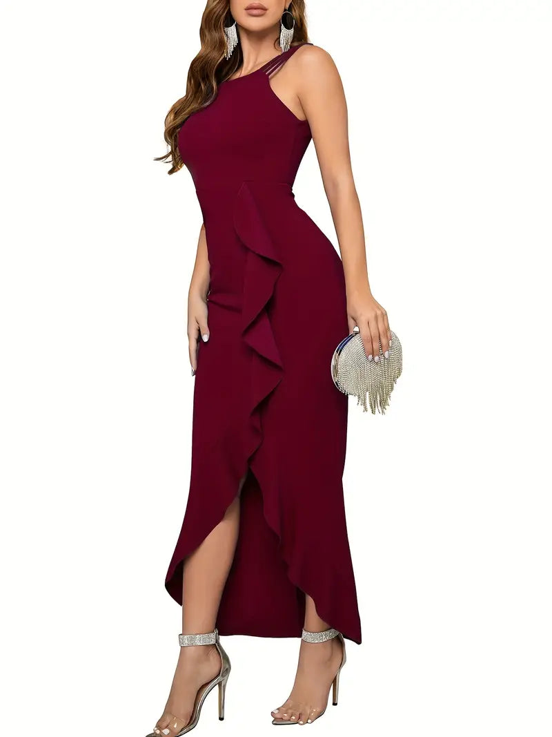 Föreställ dig en förtrollande kväll i denna eleganta klänning som visar upp alla dina rörelser till perfektion. Med en slits och en flödande fåll kommer du inte bara att känna dig vacker utan också självsäker. Den här klänningen är perfekt för fester, cocktails och andra speciella tillfällen.