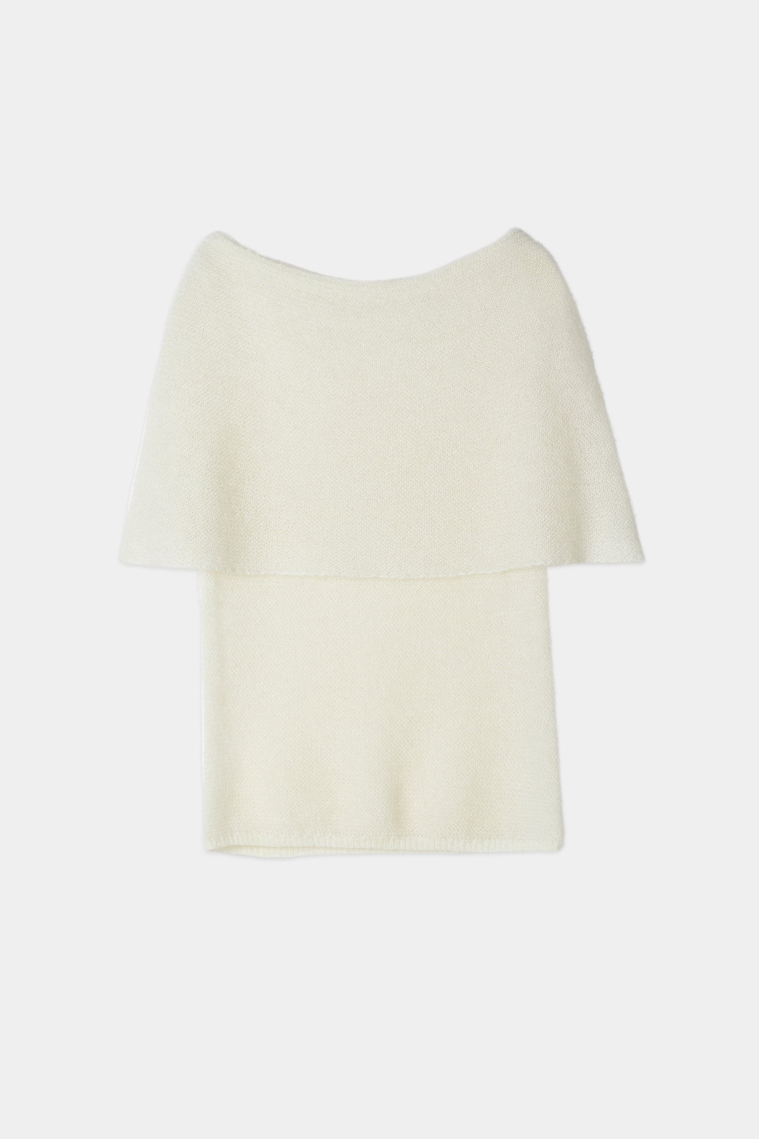 Sofia | Elegant stickad topp i mohairblandning, som kombinerar lyx och modern design. Tillverkad av en lyxig mohairblandning har denna ärmlösa topp en elegant cape-overlay som skapar en iögonfallande silhuett. Den elastiska kragen säkerställer en säker men bekväm passform, vilket gör den till ett lättburet plagg för både avslappnade och mer sofistikerade outfits.