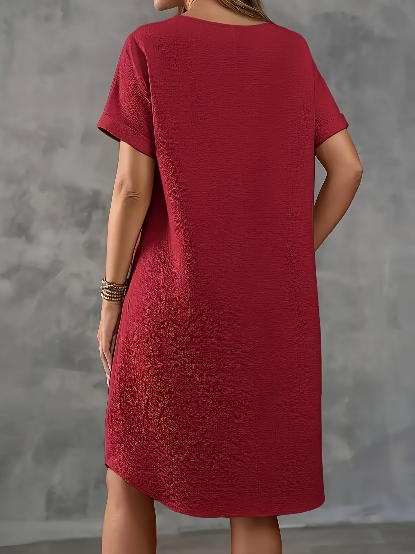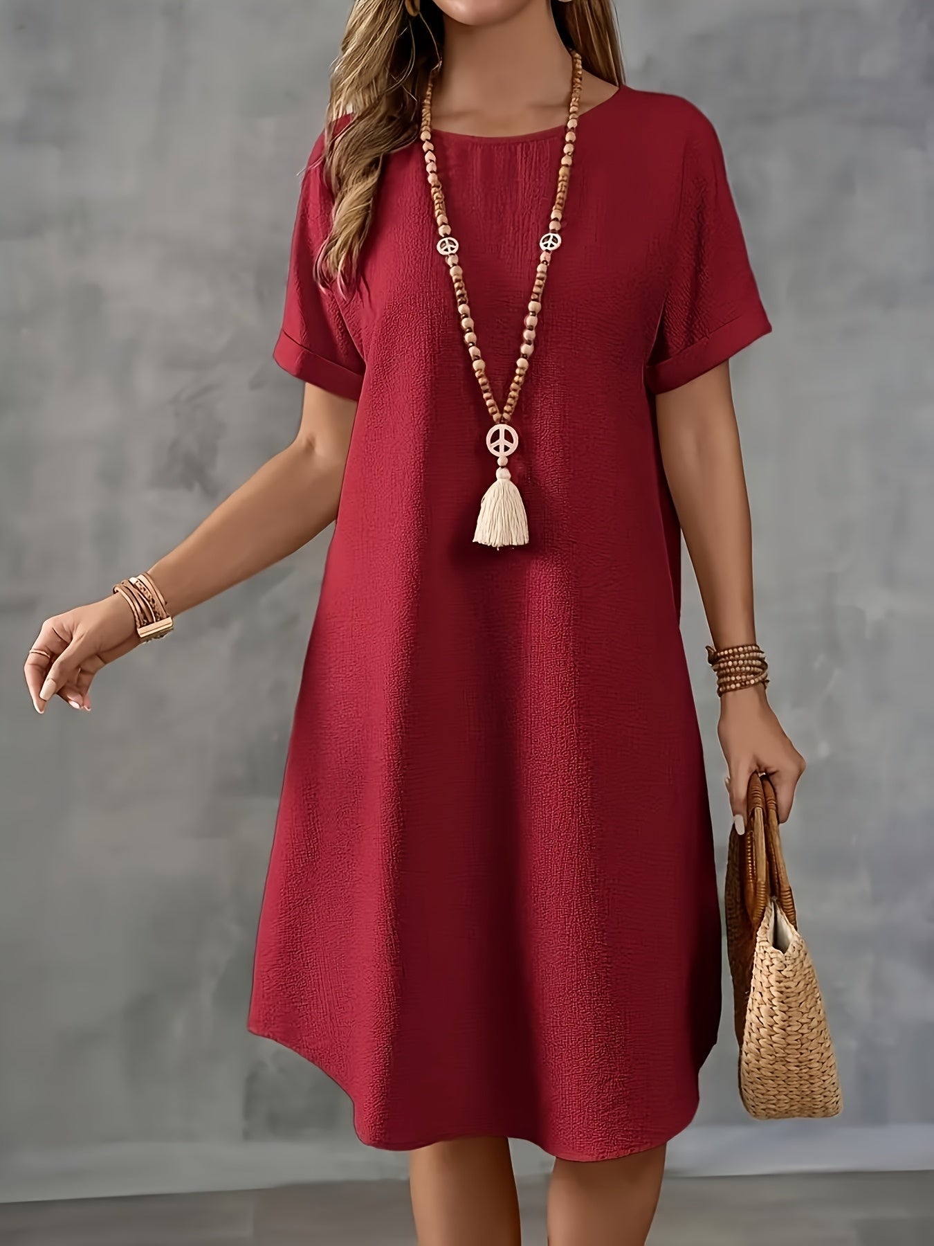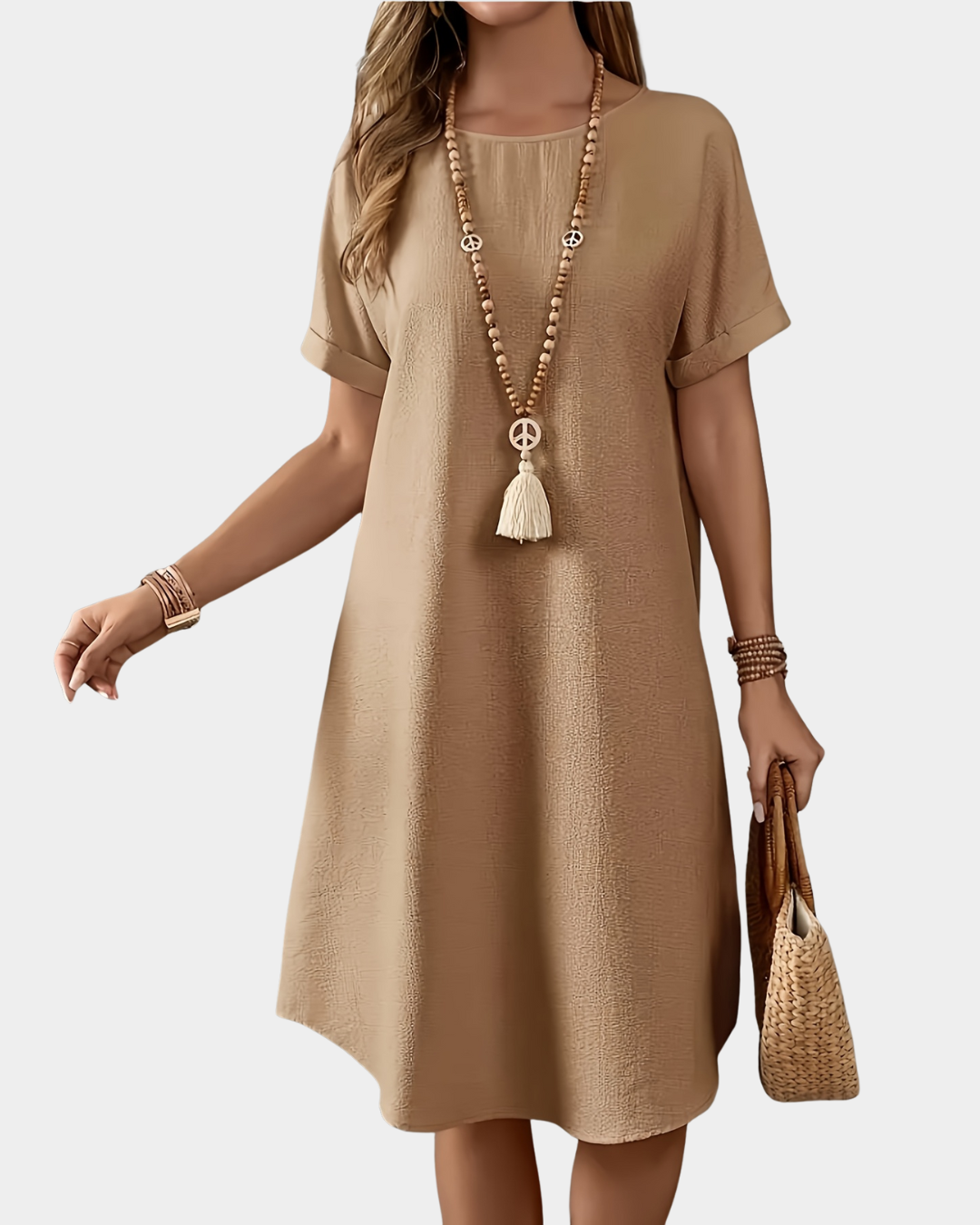 Tove är klänningen som lyfter varje sommardag. Den figursmickrande A-linjeformen och strukturerade tyget skapar ett elegant fall som känns lyxigt men ledigt. Perfekt för både vardag och speciella tillfällen.