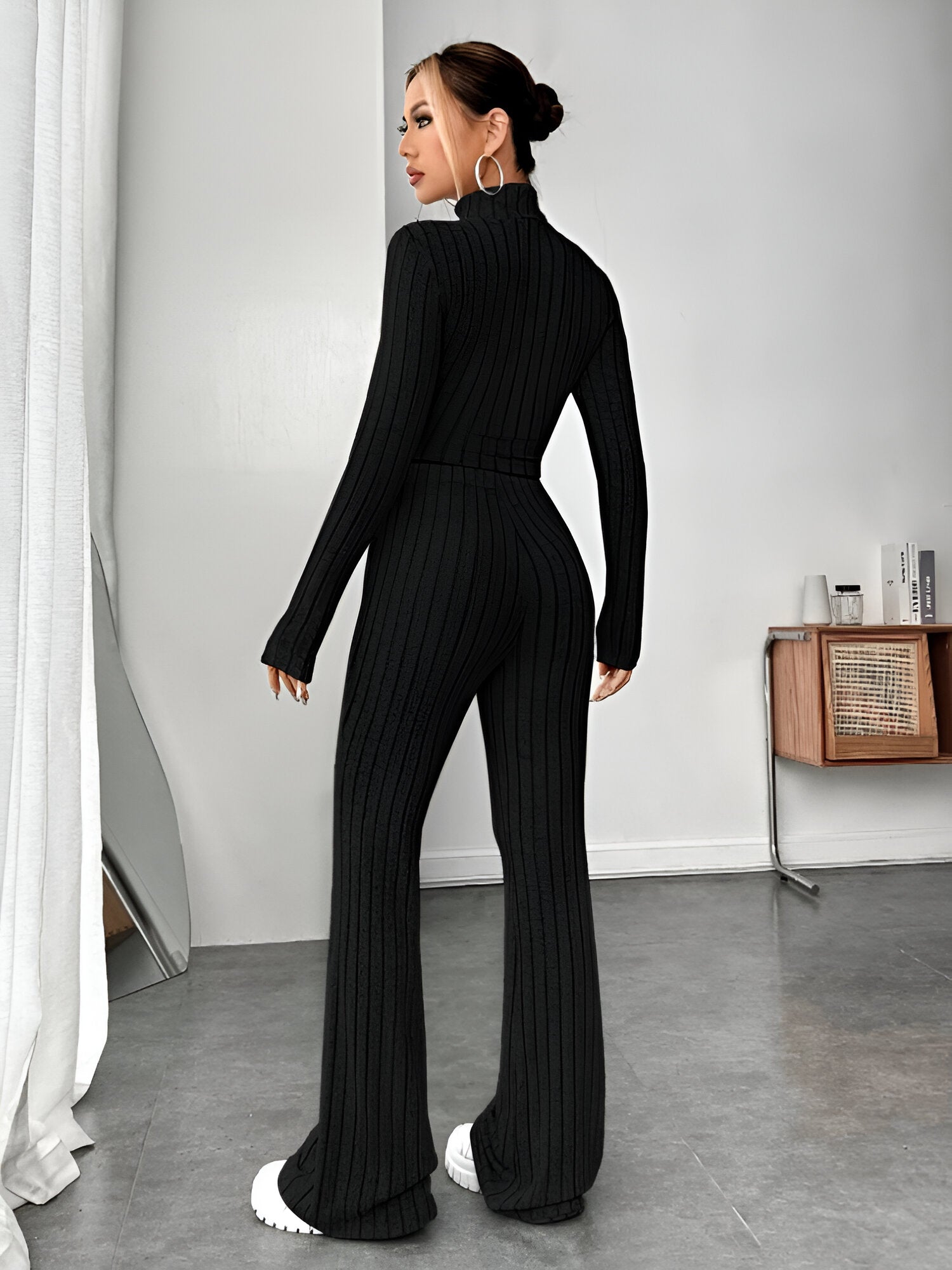 Tänk dig att börja dagen i en outfit som är både mysig och snygg. Det här tvådelade setet i mjuk trikå och smickrande randigt mönster är perfekt för alla tillfällen - från en avslappnad dag hemma till en avslappnad träff med vännerna. Uppstående krage och långa ärmar håller dig varm, medan byxorna med smal passform ger dig en modern, smickrande look.