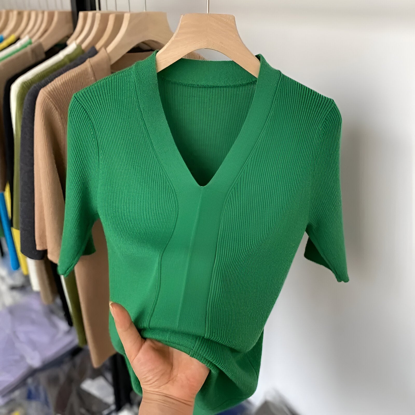 Tänk dig att glida in i en lätt, luftig jumper som på ett enkelt sätt kombinerar komfort och stil. Den kortärmade V-ringade designen ger en smickrande, figurnära passform - perfekt för lager på lager eller att bära ensam. De fina ränderna och det mjuka stickade tyget ger en elegant touch till din vardagslook. Oavsett om du njuter av en varm eftermiddag eller klär dig för svalare kvällar är den här jumpern den perfekta följeslagaren för enkel stil.